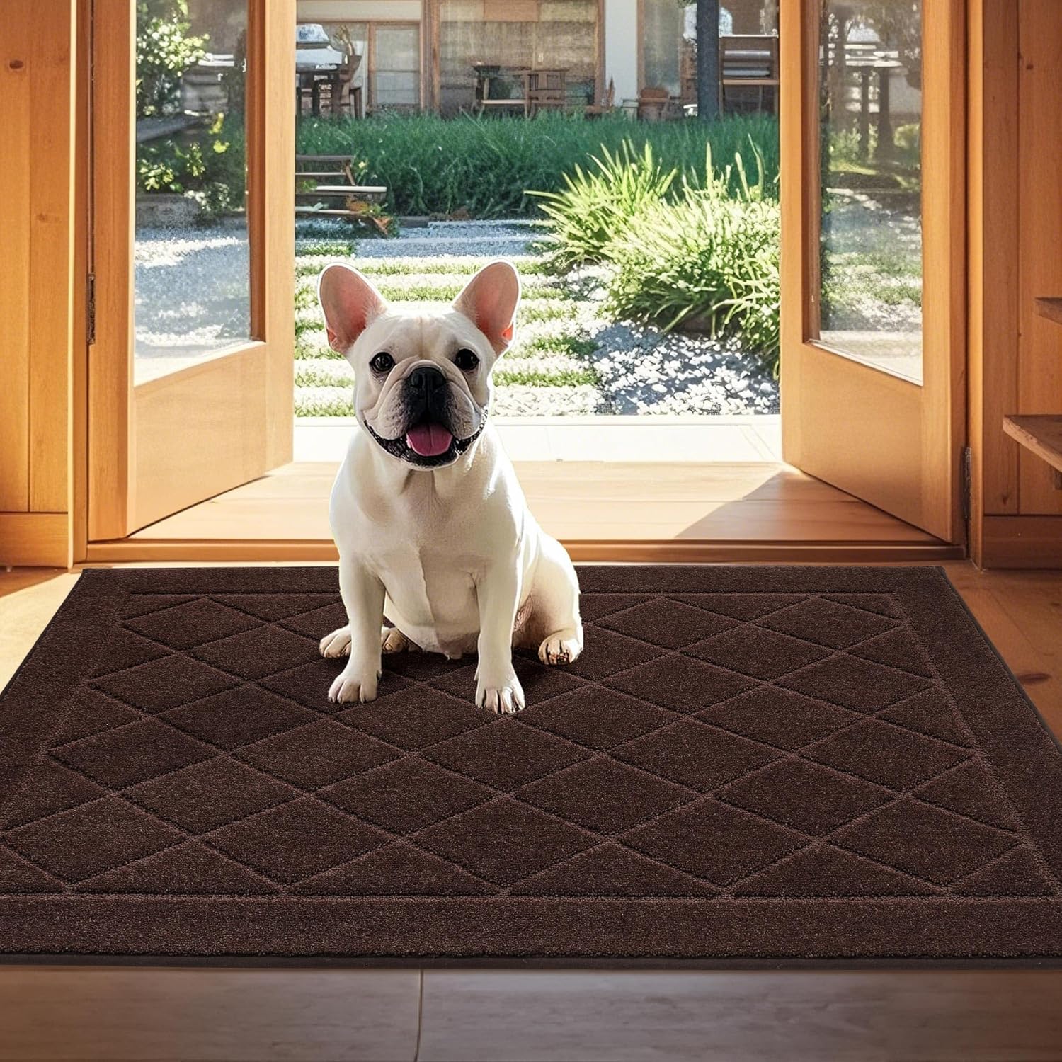 - TRAPS DIRT & MOISTURE: Engineered with tightly-woven Polyester fibers, this entry mat effectively traps dirt and water from footwear. The high-density yarn structure resists stains while accelerating moisture evaporation, ensuring cleaner floors during rainy, snowy, or muddy days. Note: Natural lighting may cause slight color variations.
