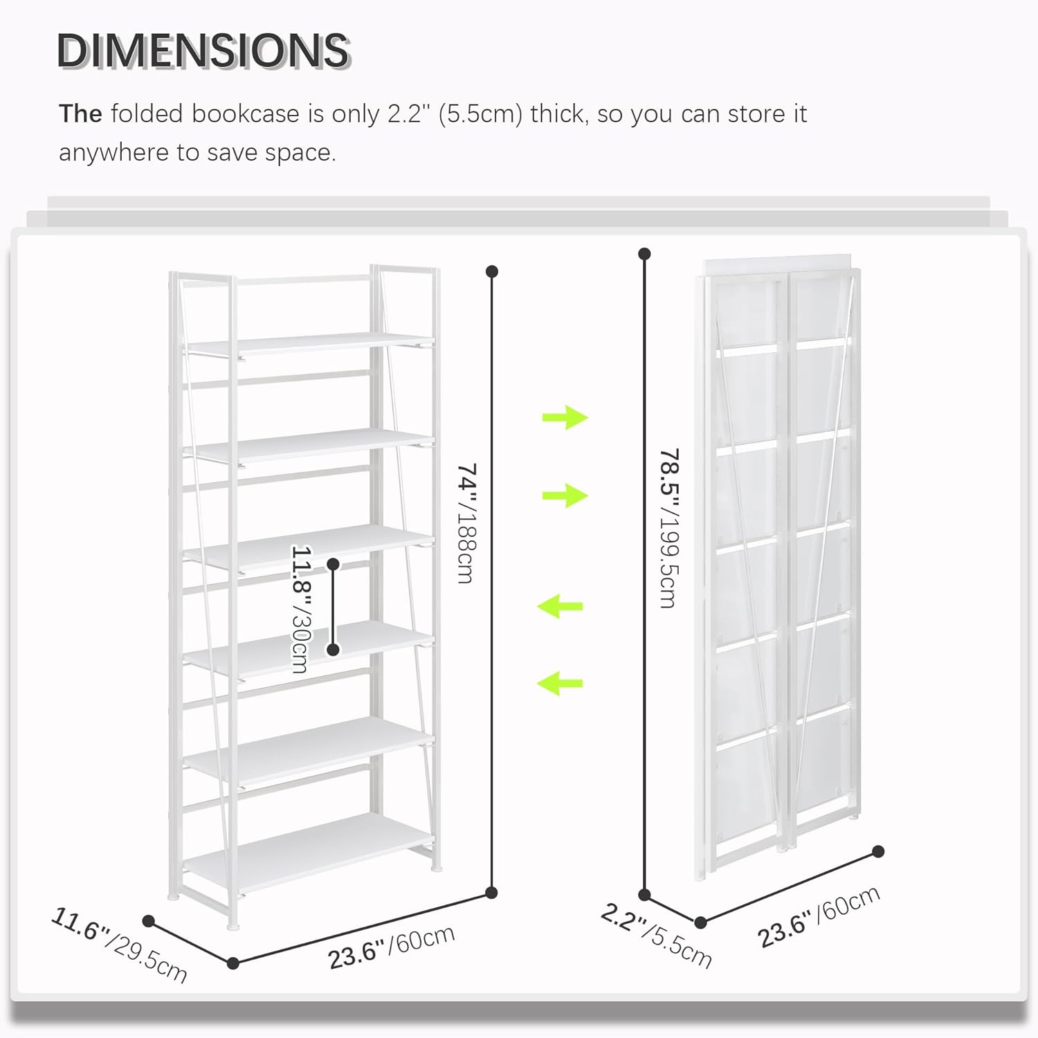 4NM No Assembly Foldable Bookshelf, 6-Shelf Collapsible Bookcase Storage for Small Spaces, 74" H, All White