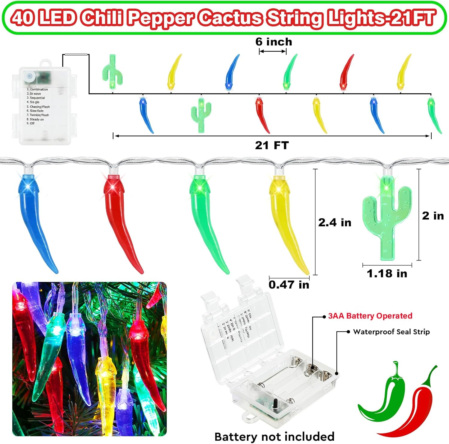 - 🌶️Bright Chili Pepper Cactus String Lights:40 LED Summer Beach Hawaiian String Lights with 4 vibrant chili pepper colors (red, blue, green, yellow) and playful cactus designs are perfect for bringing a touch of summer to your bedroom, pool party, beach party, or holiday decor. Hang these charming lights anywhere to create a cheerful and lively tropical atmosphere for your party or family gathering.