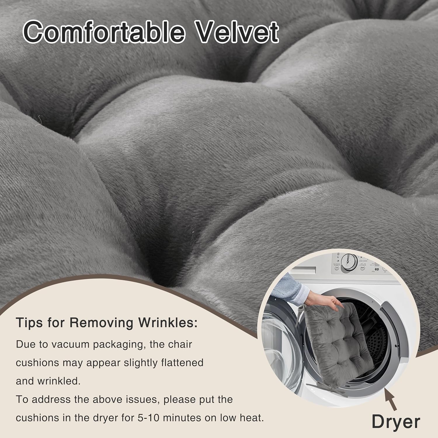 - Tips for Care: Due to the large volume of the tufted chair cushions, it is packed in a vacuum bag to prevent damp and dust.If you find that it is slightly flat or a little creased after opening, it can be restored to its soft shape by leaving it to stand for 24-48 hours, then placing it in the tumble dryer on a low heat for 10 minutes.If it does need to be cleaned, please use a neutral detergent.