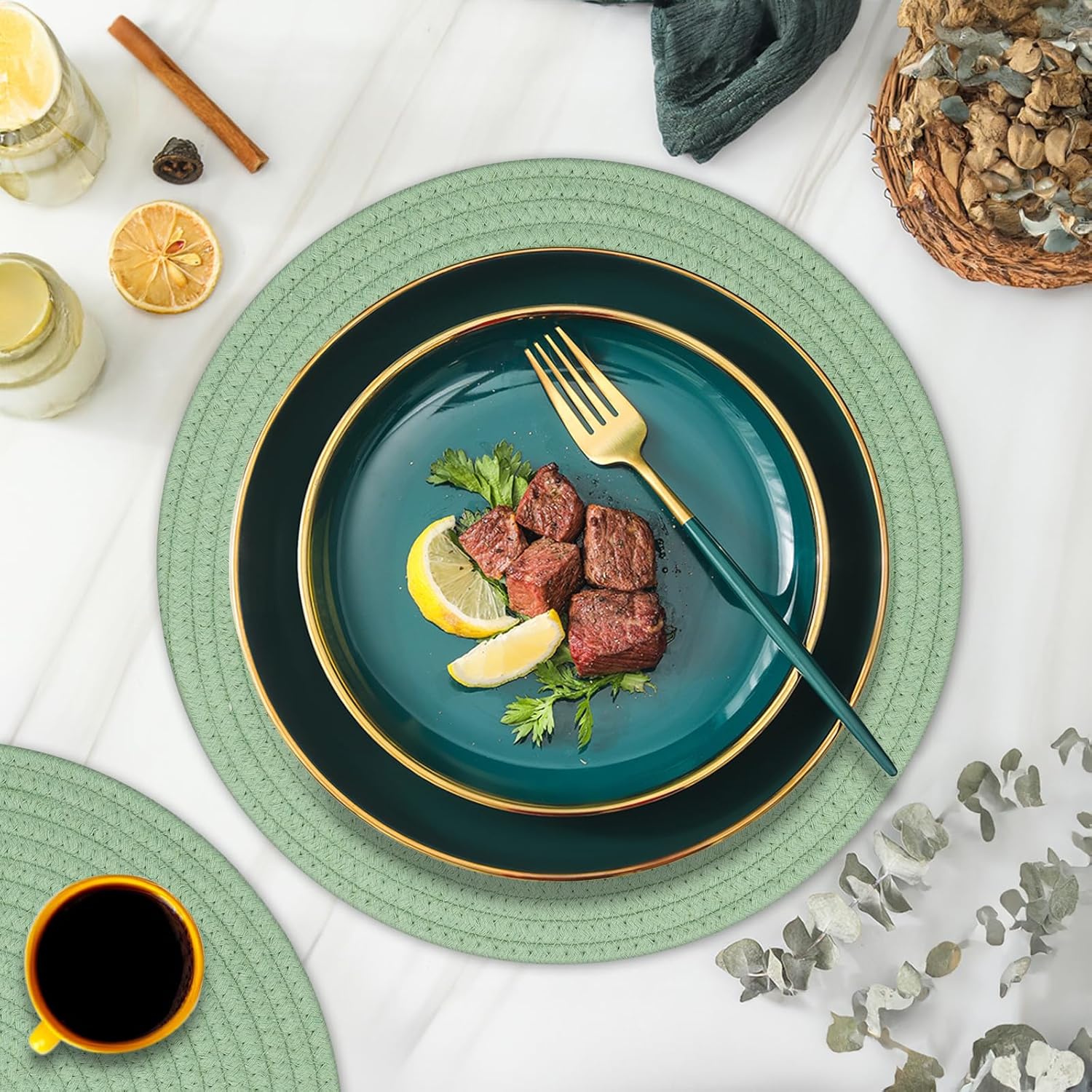 - Material: Our placemats are made of woven cotton rope, not easy to deform, double sided available. The placemats are wipeable, washable, heat resistant and non slip.
