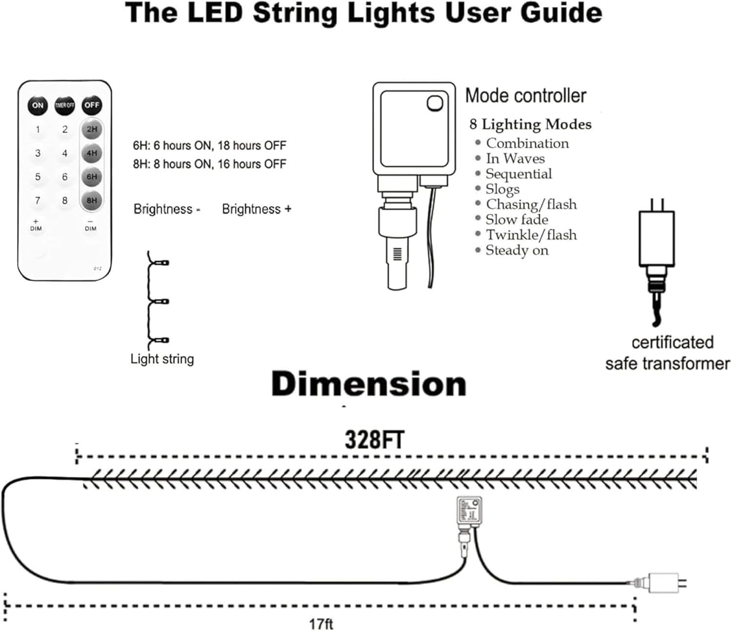 - Remote Control: The Halloween string lights can be controlled with wireless remote, you can set different modes, timer, brightness, etc. There are 8 lighting modes (combination, in waves, sequential, slo-glo, chasing/flash, slow fade, twinkle/flash, steady on). It also has 4 timer modes, "2H" (2 hours on/22 hours off), "4H" (4 hours on/20 hours off), "6H" (6 hours on/18 hours off), "8H" (8 hours on/16 hours off)