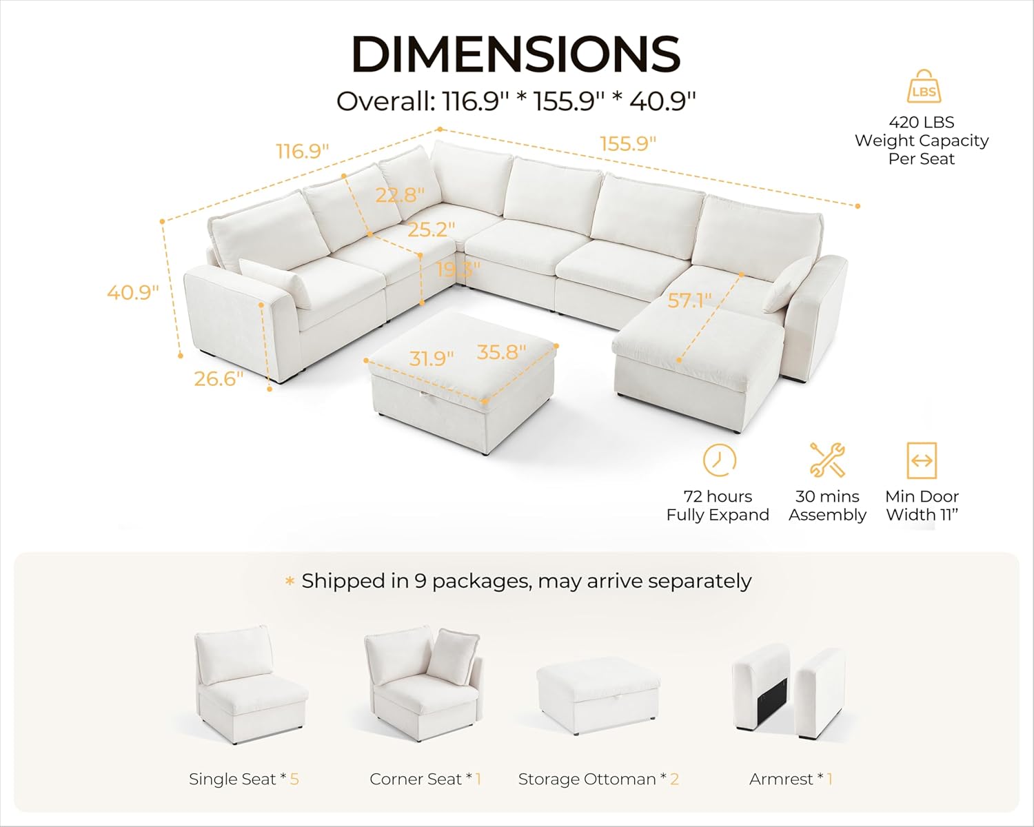 - ăMultiple Packages & Dedicated Supportă Your cloud modular sectional couch ships in 9 separate packages, which may arrive at different times. If you receive only some boxes, donât worryâmore are on the way! Need additional tracking details or assistance? Weâre happy to helpâjust reach out! Our team is here to ensure you receive everything as expected and guarantee a smooth, hassle-free shopping experience with your complete satisfaction