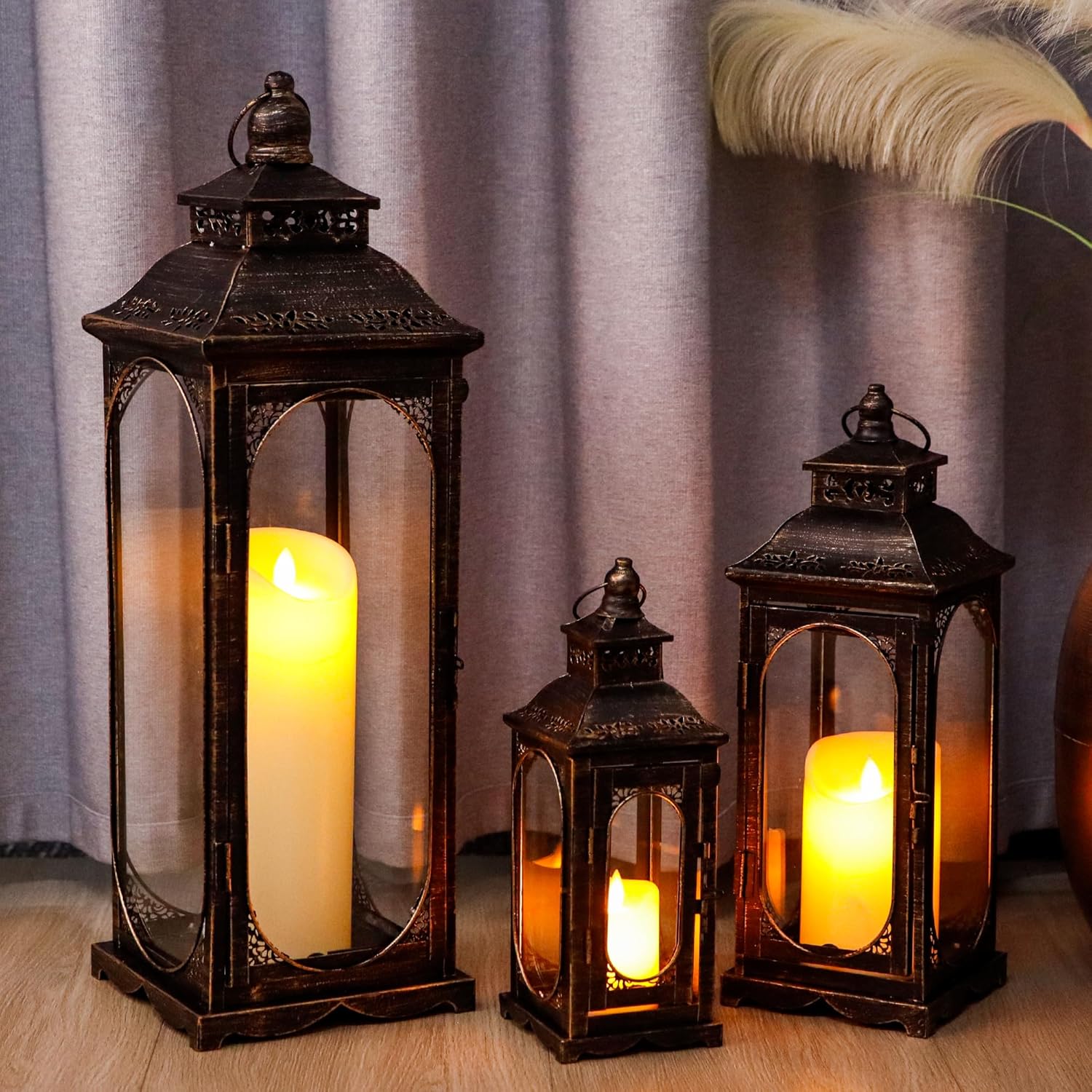 TRIROCKS Set of 3 Vintage Candle Lanterns 10/14/19.5''H Decorative Outdoor Lantern Metal Candle Holder with Tempered Glass for Home Living Room Garden Yard Event Indoor Outdoor (Black with Gold Brush)