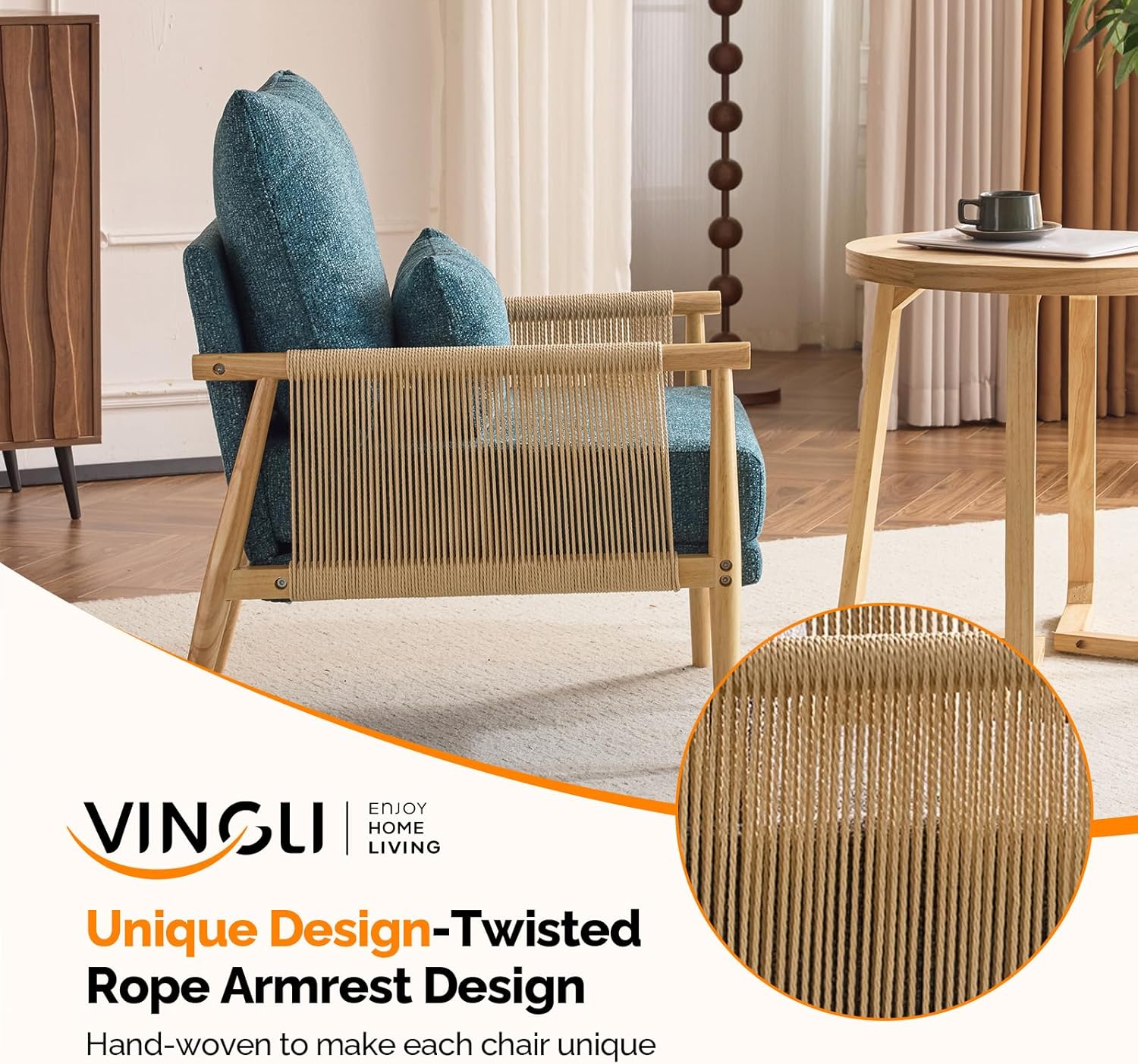 VINGLI Boho Braid Accent Armchairs Set of 2,Mid-Century Modern Chiars with Solid Wooden Armrest,Comfy Louge Cushion Chairs with Waist Pillow for Bedroom,Living Room,Reading Room, Teal