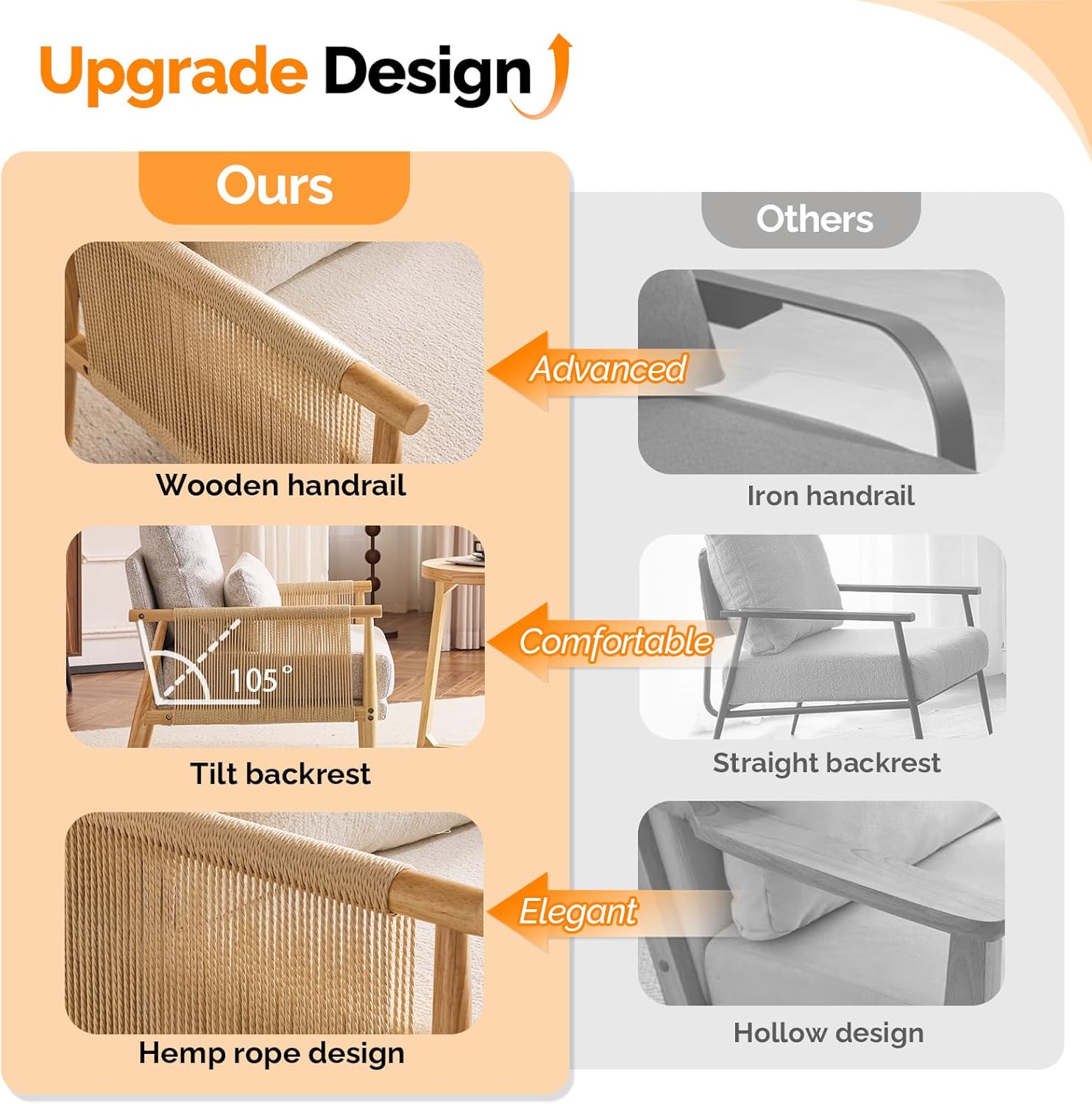 VINGLI Boho Braid Accent Armchairs Set of 2,Mid-Century Modern Chiars with Solid Wooden Armrest,Comfy Louge Cushion Chairs with Waist Pillow for Bedroom,Living Room,Reading Room, Light Grey