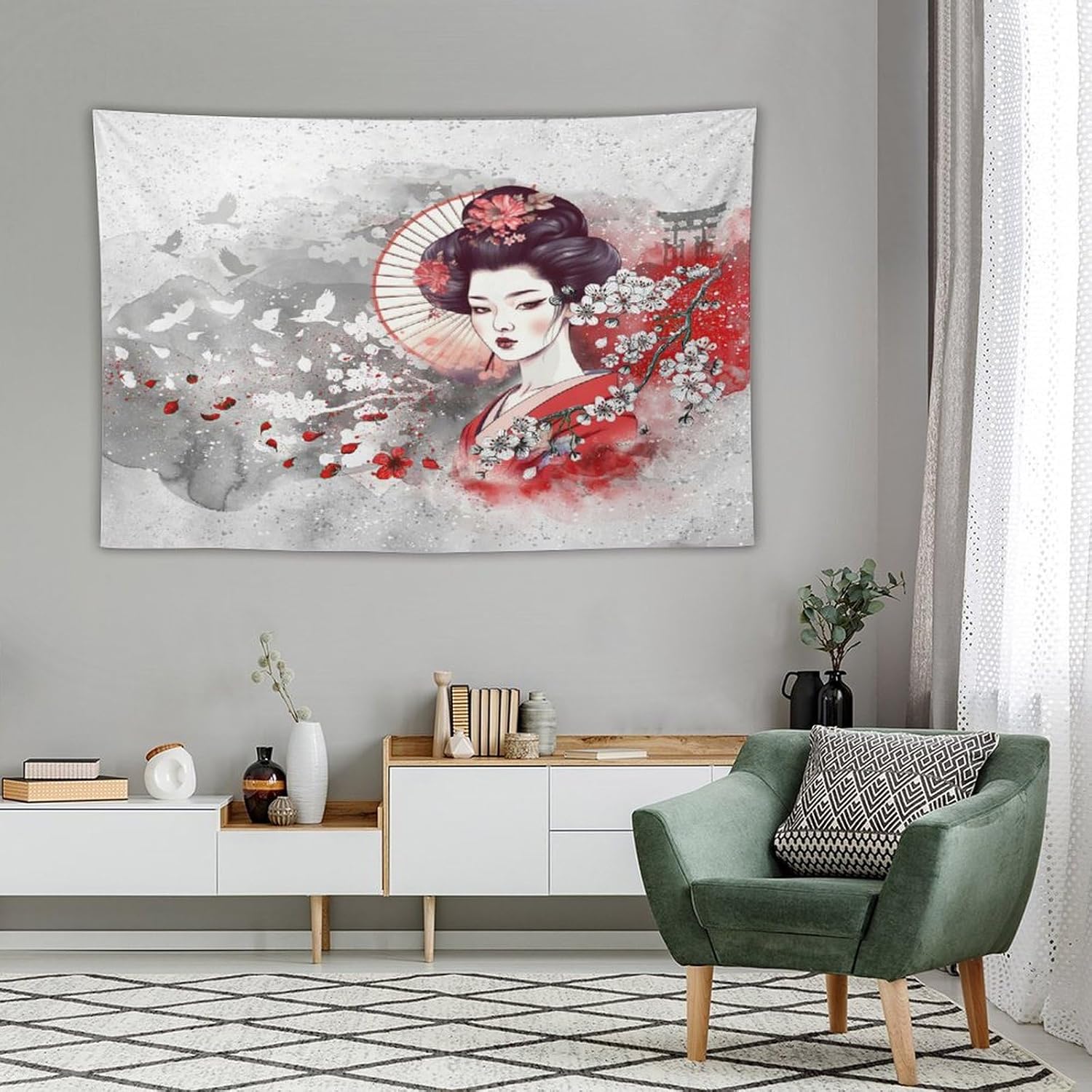 Japanese Geisha Tapestry Asian Red Cherry Blossom Traditional Kimono Folk Tapestries Home Decor for Living Room Bedroom Apartment Farmhouse Dorm 90"x60"