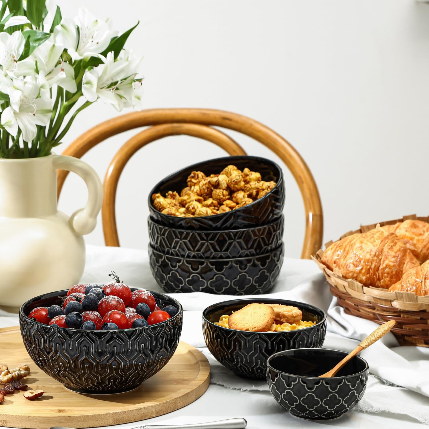 - STACKABLE & SAVE SPACE: These ceramic bowls set are stackable and save cabinet space. Cute design and stack well make your cabinet tidy and it will definitely elevated your kitchen look. Safe for dishwasher, freezer, microwave, and oven as well