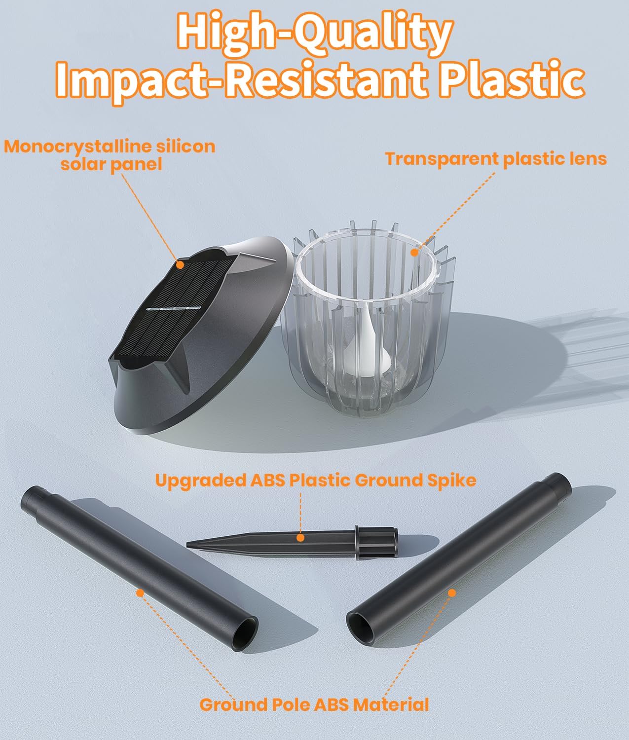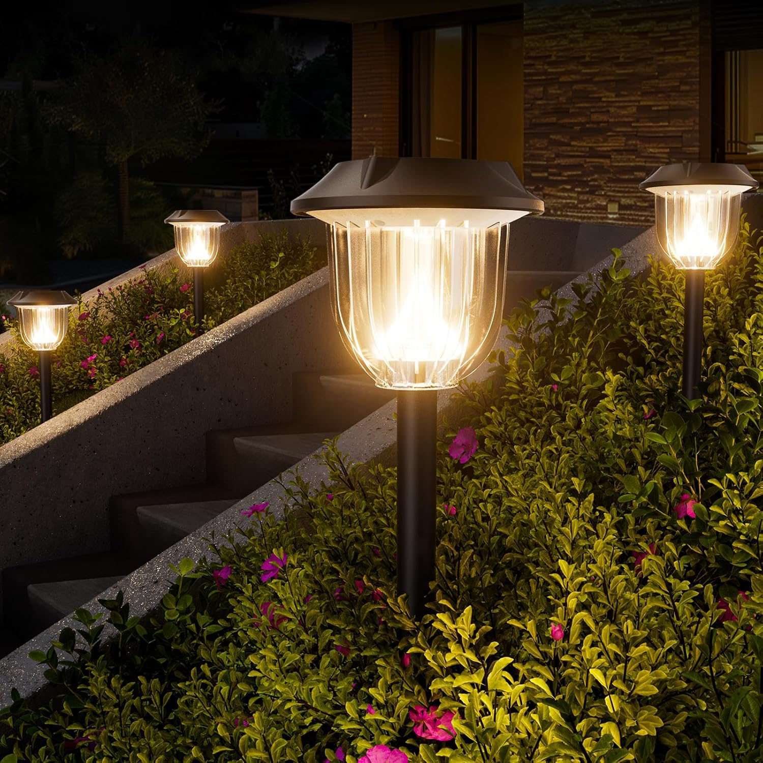 - DURABLE SOLAR OUTDOOR LIGHTS: The transparent lampshade of the solar pathway lights is made of ultra-thick, durable PC material, while the rest of the solar light is constructed from sturdy, UV-resistant ABS plastic.AOSEA solar garden lights offer a bright, soft glow, lighting up outdoor spaces like gardens, lawns, and pathways while creating a cozy, romantic ambiance for your evenings.