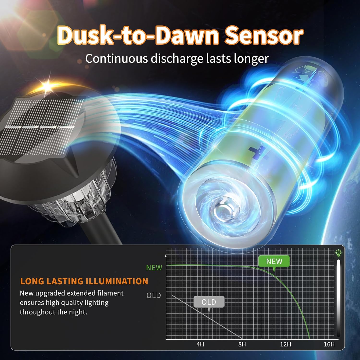 - DUSK TO DAWN LIGHT UP OUTDOOR LIGHTS: Solar powered lights automatically turn on at night and turn off at dawn which enables led pathway light conserves battery life for when itâs needed most. The solay walkway lights provide a good amount of illumination after a sunny day.