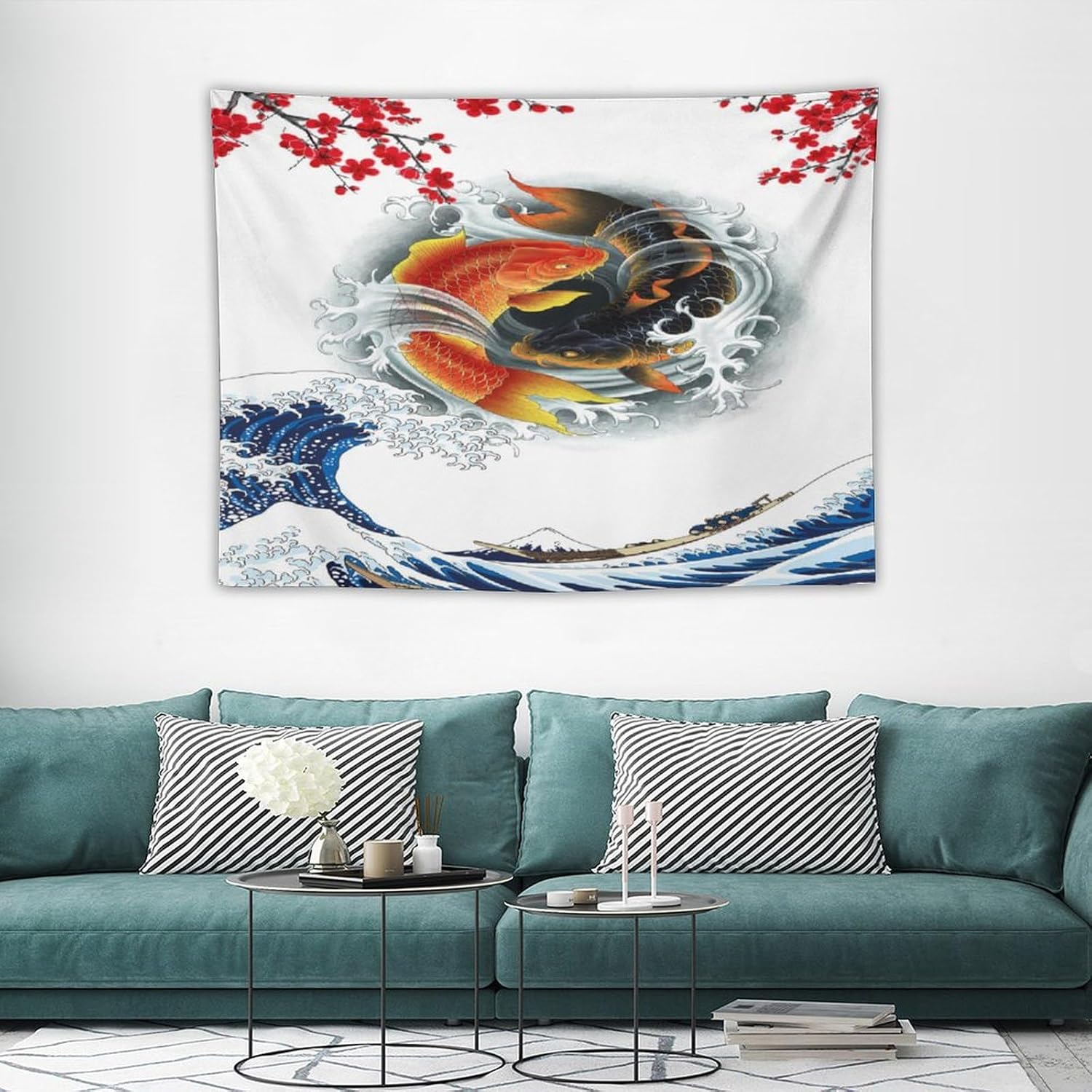 Houselerax Koi Fish Tapestry, Japanese Style Yin Yang Big Wave Cherry Blossoms Tapestries Wall Hanging for Bedroom Living Room Office Decor 40"x30"