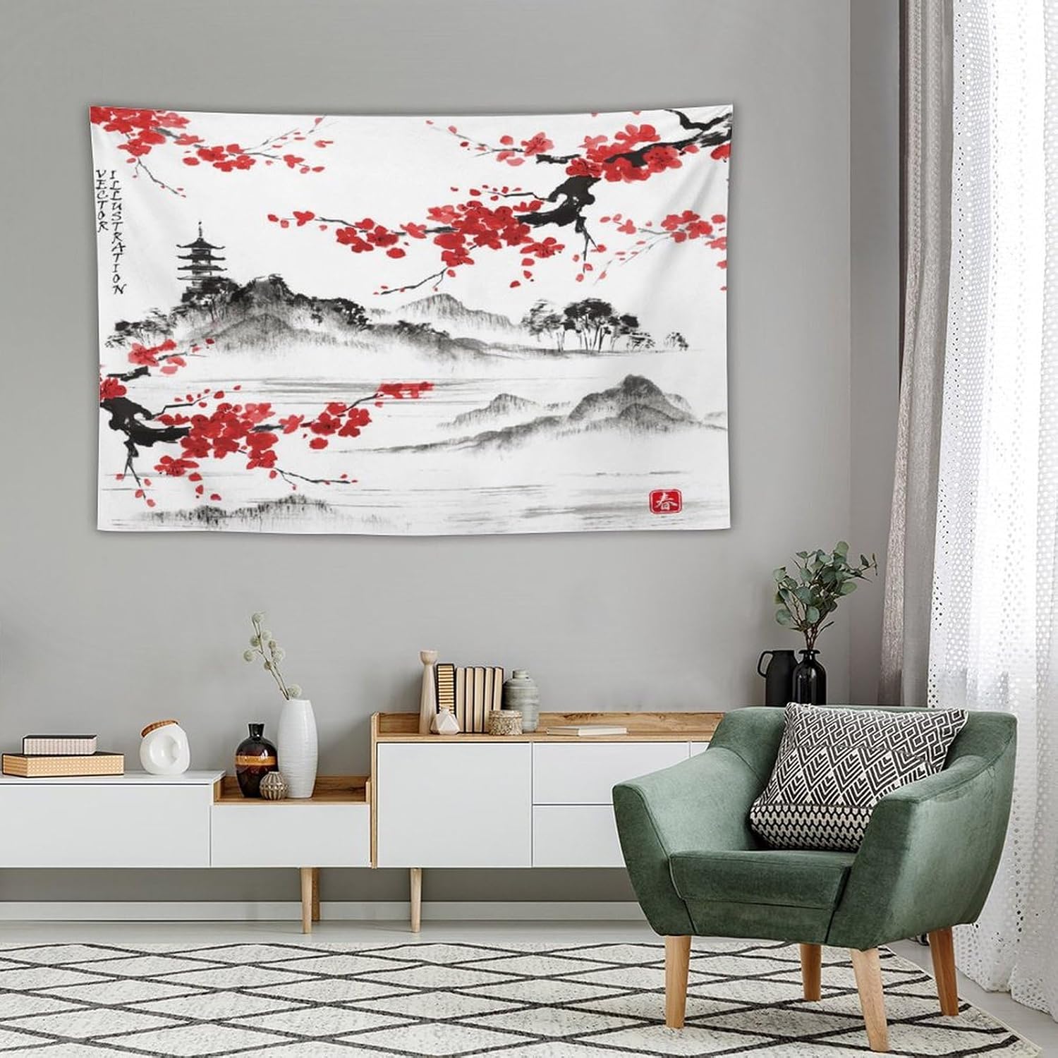 Cherry Blossoms Tapestry, Japanese Fuji Mountain Tapestry, Asian Japanese Wall Tapestry, Nature Landscape Tapestries for Bedroom Living Room Decor 90"x60"