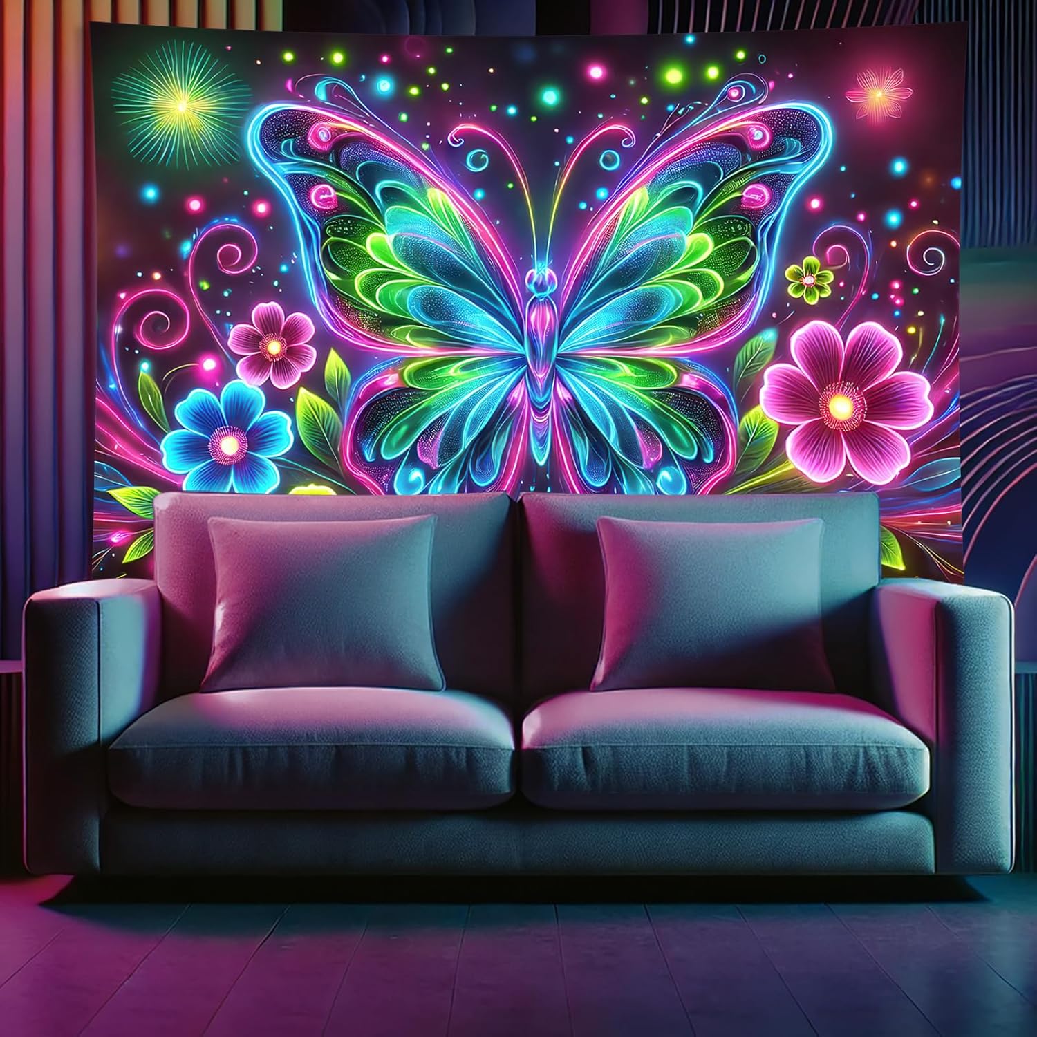 - Perfect gift for butterfly lovers: an ideal gift for those who adore butterflies or unique artistic designs. This Blacklight Butterfly Tapestry makes a wonderful present for birthdays, housewarmings, or any special occasion, adding charm and a luminous touch to any space.