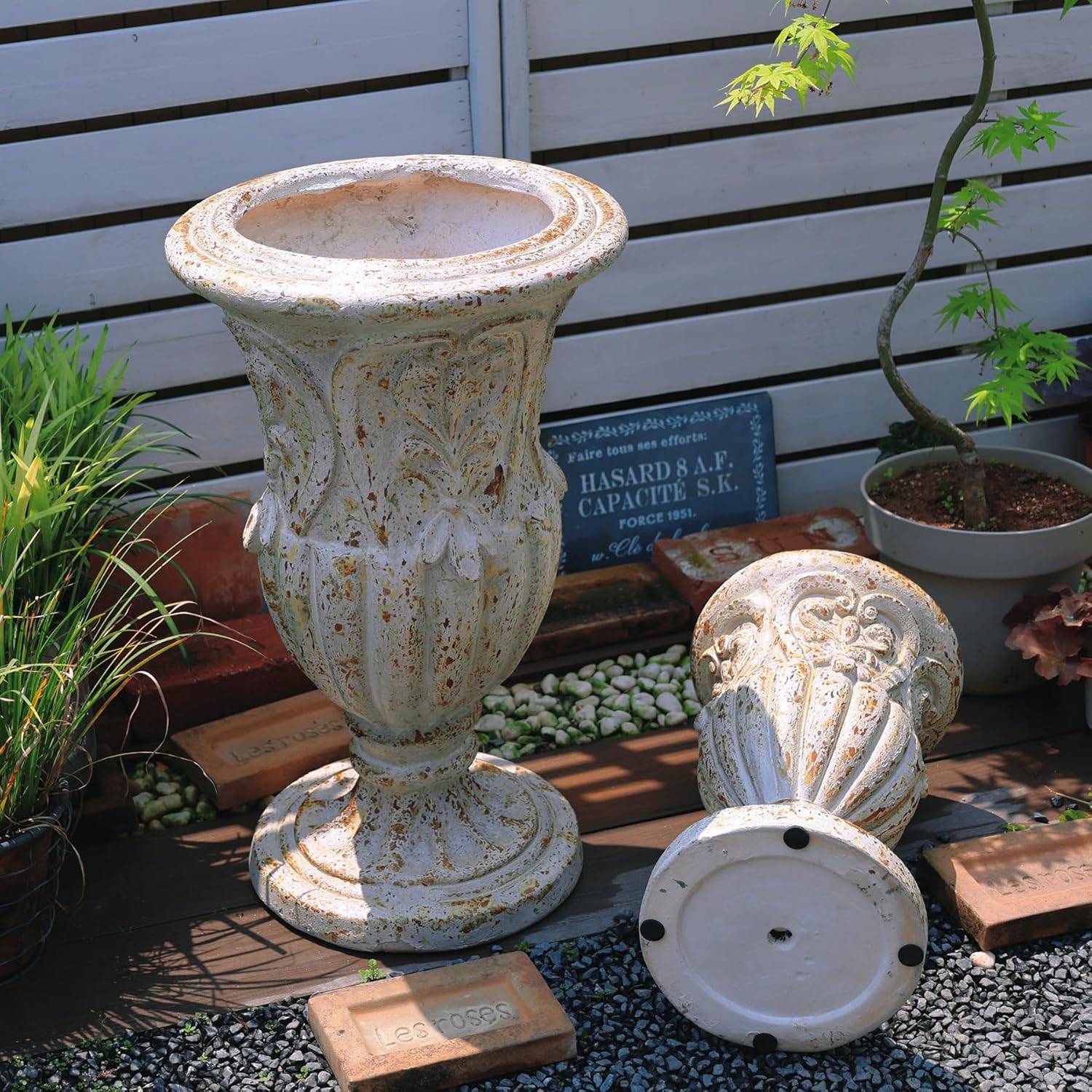 - CLASSIC DESIGN: Elegant European-style urn planter featuring intricate floral patterns and a weathered white finish for timeless garden appeal