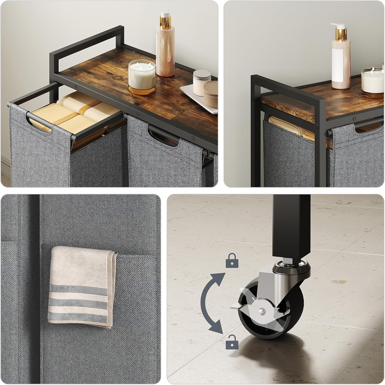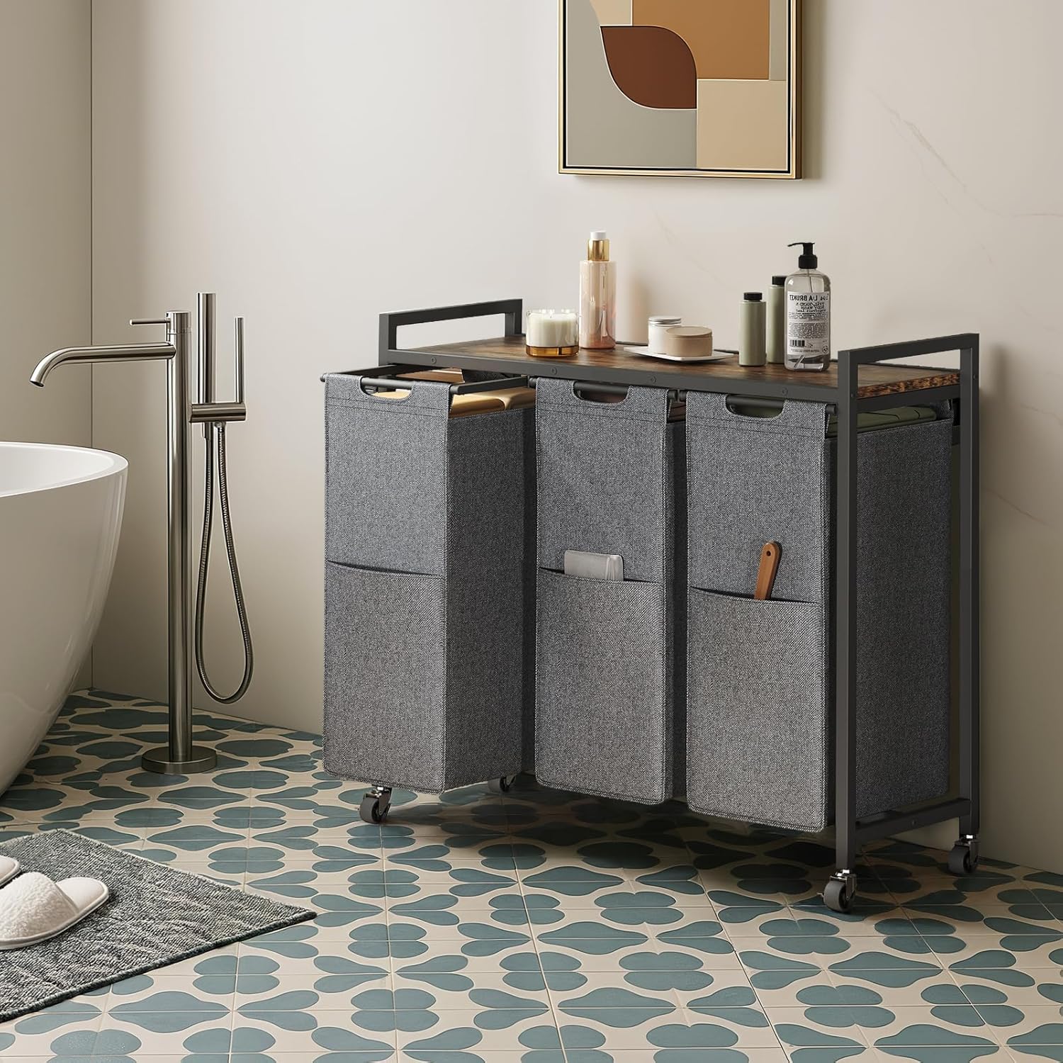 HOOBRO Laundry Sorter 3 Section, Laundry Hamper with Wheels, 3 × 11.5 Gal (43.4L), Rolling Laundry Basket, Pull-Out and Removable Oxford Fabric Laundry Bags, Rustic Brown and Grey BFG76XY01