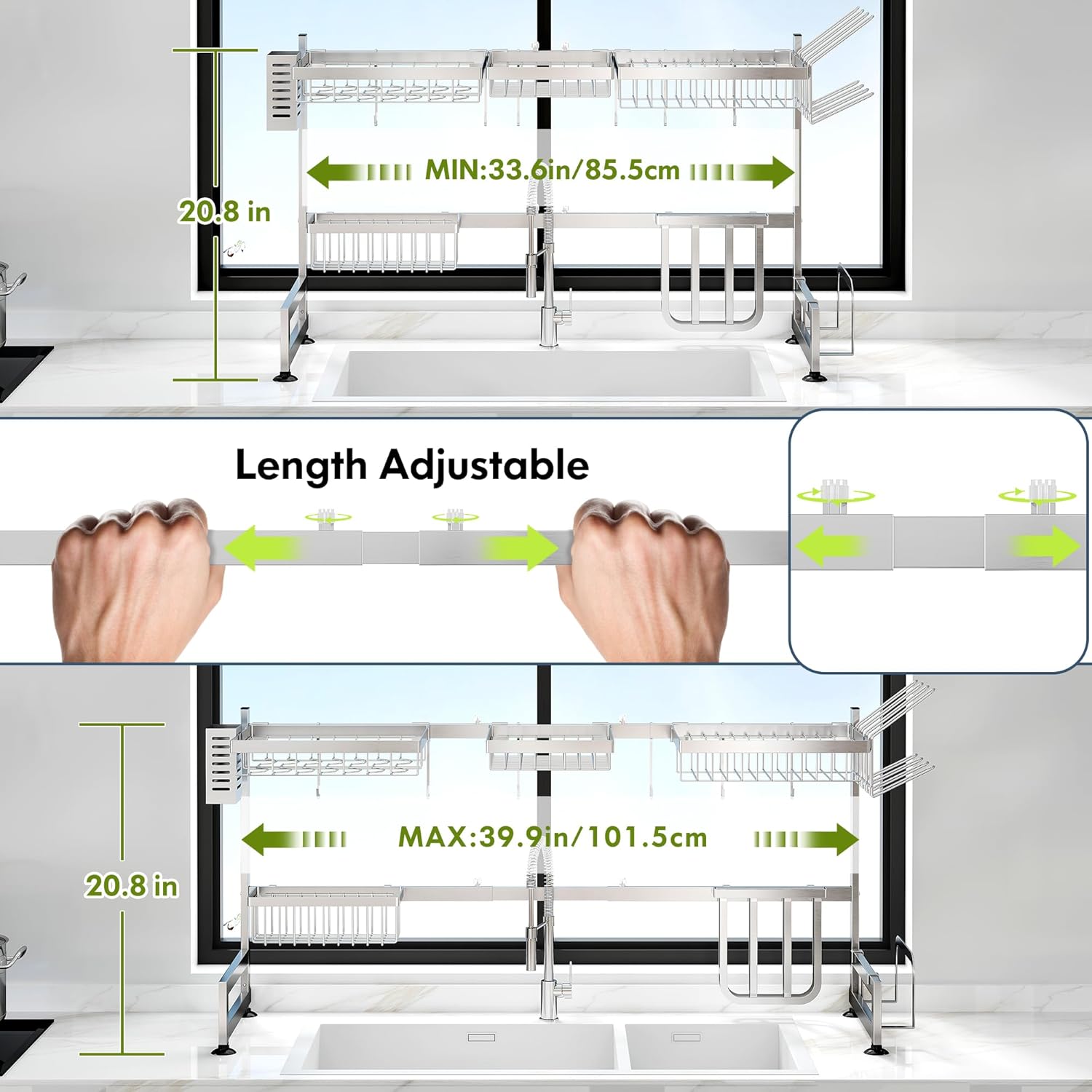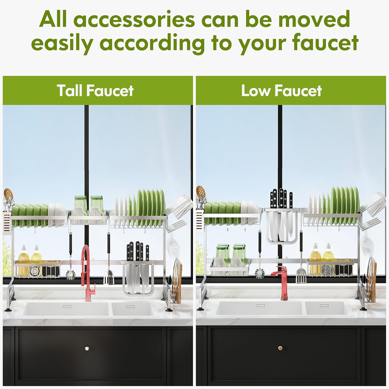 - 🔄 Expandable Design for Custom Fit: Adjust the over sink dish drying rack width effortlessly to span most standard single or double sinks, adapting seamlessly to your kitchen layout. The dish drain modular design allows rearranging tiers and accessories to prioritize space for tall glasses, wide pans, or cleaning tools, maximizing vertical storage above the sink