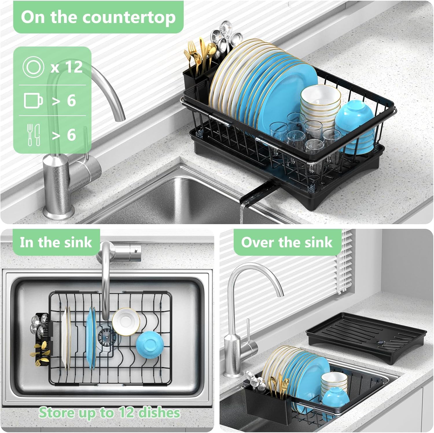- USE SAPARATELY: The drying mat can not only be used to collect dripping water, but also be used separately from the rack to dry fruits, cups and more; while the rack sits on the sink with plates and utensil. A multi-use in sink dish drying rack to maximize your space and create a clean and tidy kitchen.