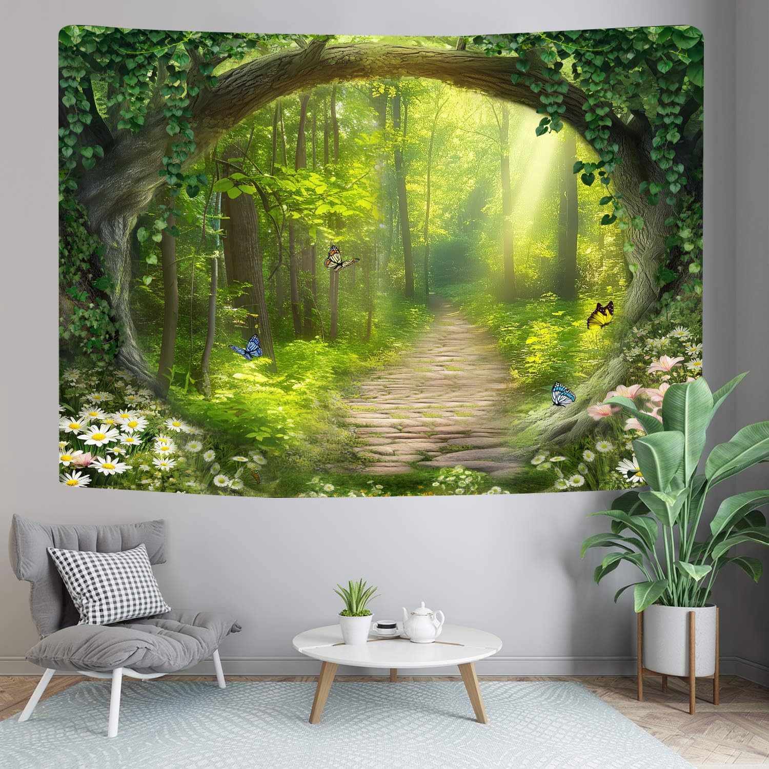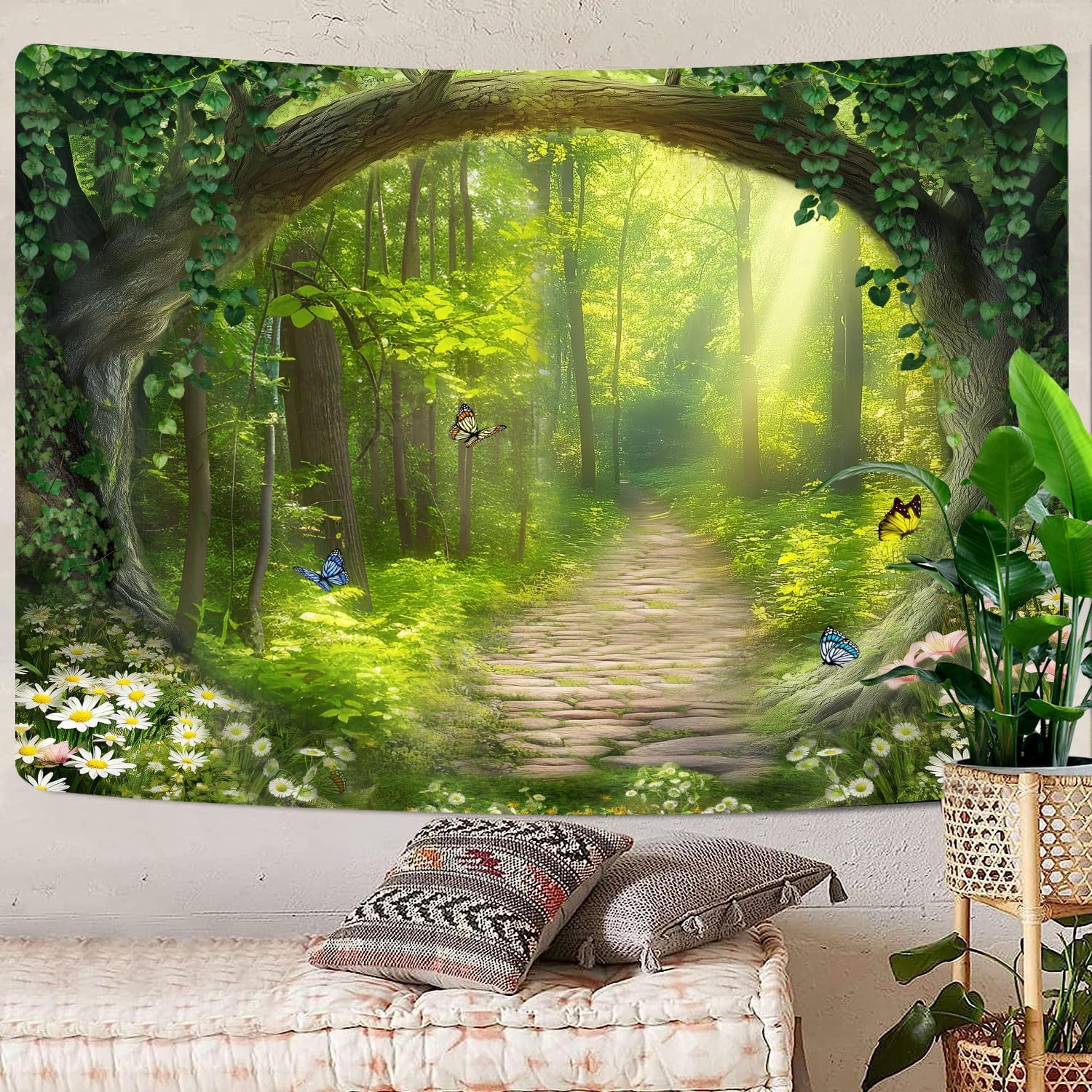 Nature Enchanted Forest Tapestry, Fantasy Green Jungle Woodland Lanscape Tapestries Wall Hanging, Psychedelic Fairy Tree Cave Forest Tapestry for Bedroom Backdrop Office, 60X40