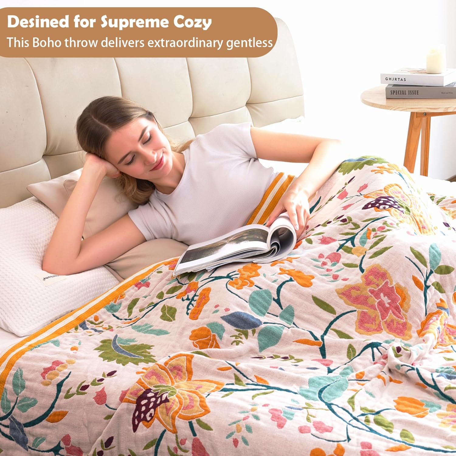Boho Throw Blanket, 100% Organic Cotton Breathable Ultra Soft 91" x 98" Bed Quilt Throw - All Season Floral Rustic Farmhouse Decor Luxury Reversible Blanket for Sofa Couch Chair and Gift