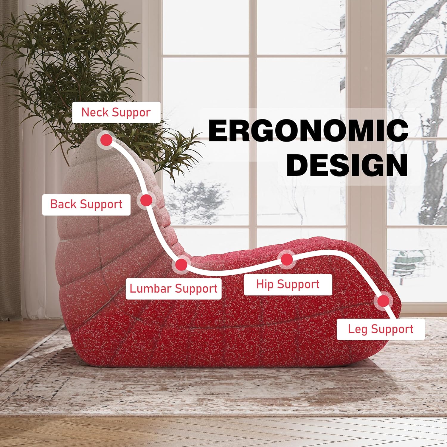 - ăErgonomic Designă-Designed with your comfort in mind, the bean bag chair features a thoughtful ergonomic design that provides exceptional support for your neck, back, lumbar, hip and leg region. The high-elastic memory foam filling conforms to your body, offering targeted support and ensuring a cozy sitting experience.