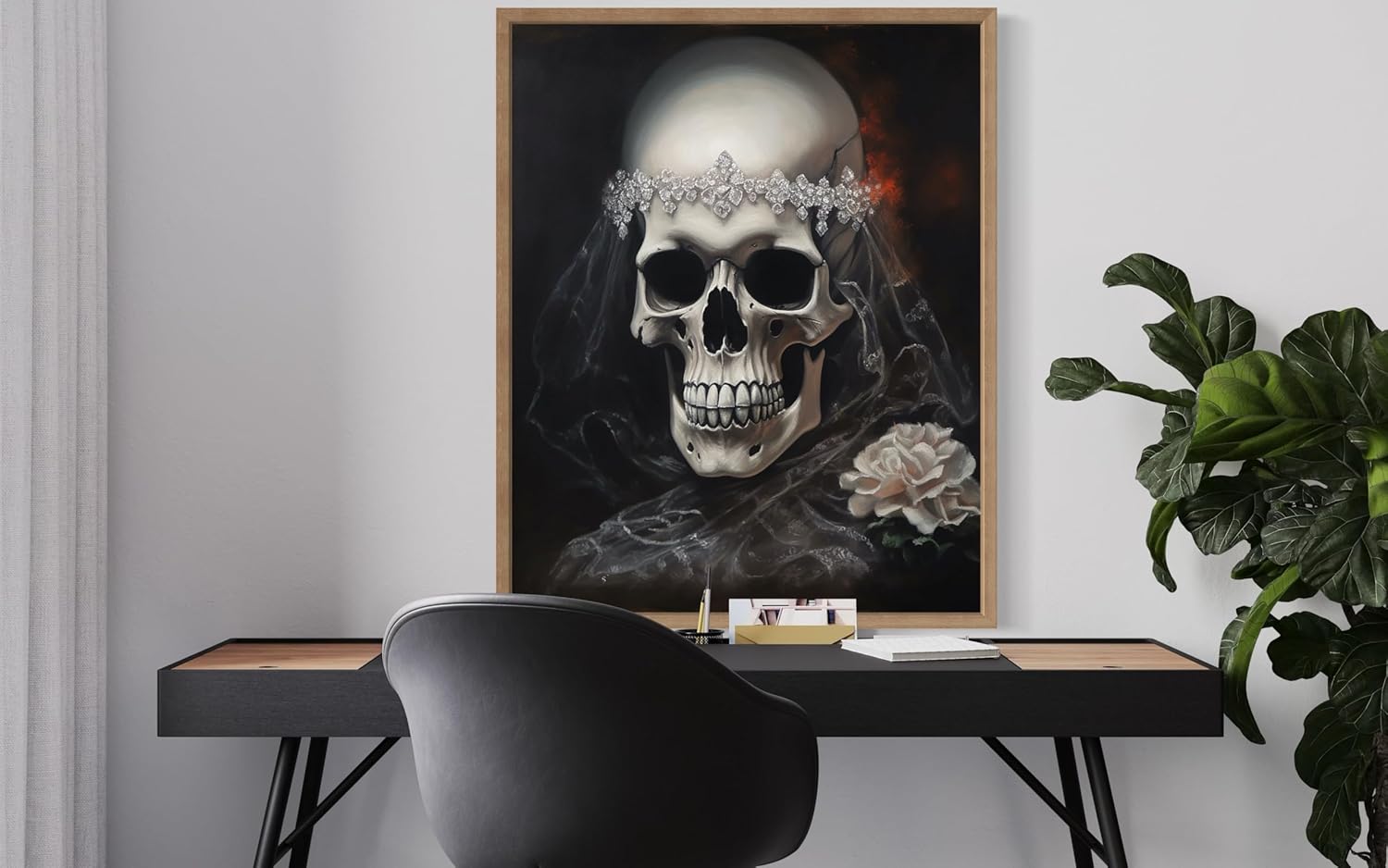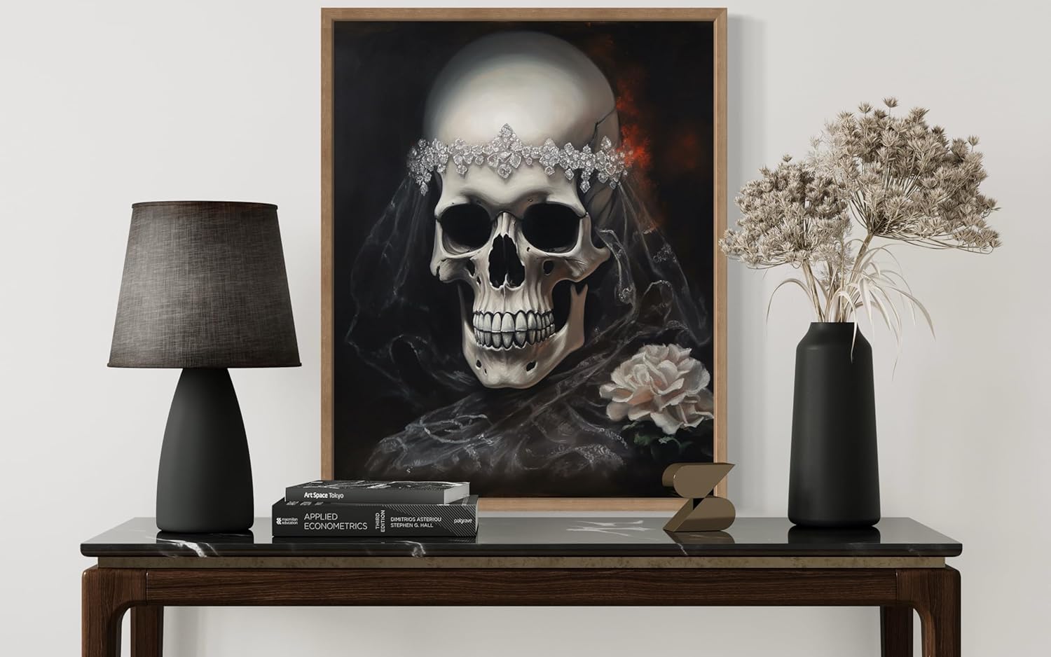 Skull Bride Poster Art Print, Halloween Scary Vintage Wall Art Academia Spooky Painting Decoration for Horror Prints, Gothic Posters Bedroom Decor 89 (Skull Bride, 8 x 10 inches, Wood Frame)
