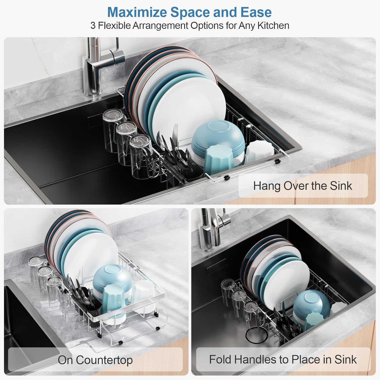 - True Expandable, Real Capacity Boost: Unlike other racks that only extend handles, our dish drainer expands as a whole unitâtruly increasing your drying space, allowing you to comfortably hold at least 3 extra cups in addition to 6 plates, bowls, utensils, and even fresh fruits and veggies. This innovative design not only ensures perfect sink compatibility but genuinely maximizes your drying area