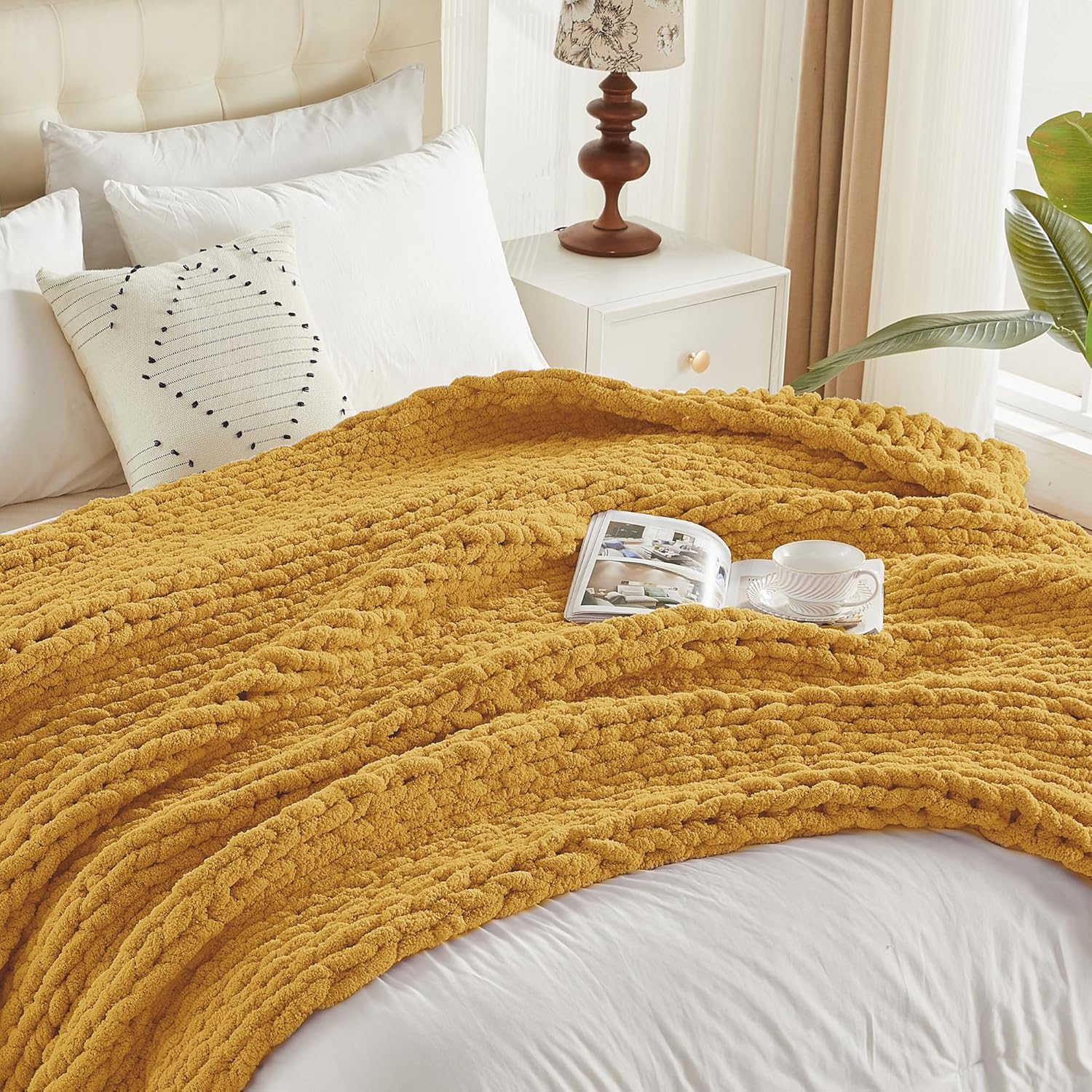 Carriediosa Chunky Knit Throw Blanket 50" X 60", 100% Hand Made Large Chenille Loop Yarn Soft Fluffy Throws for Couch Sofa Bed, Big Crochet Cozy Heavy Thick Cable Woven Blanket, Yellow