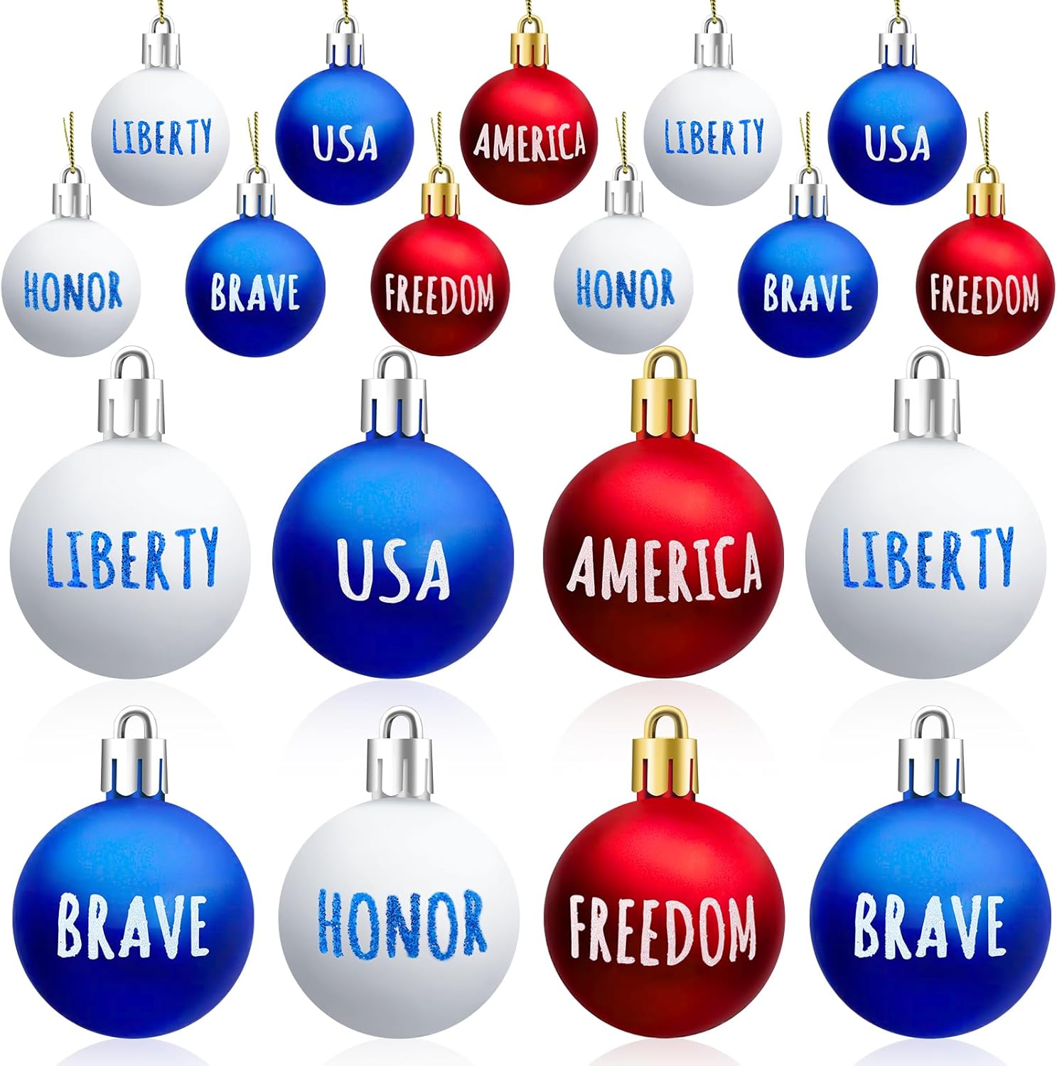 - Patriotic Ball Ornaments: The patriotic hanging decorations set includes 24 pieces 3D 4th of July ball ornaments, classic red, blue and white. The size of each Independence Day hanging ball ornament is 1.57x1.57 inches. As an ideal decoration for outdoor and indoor parties, to show patriotism