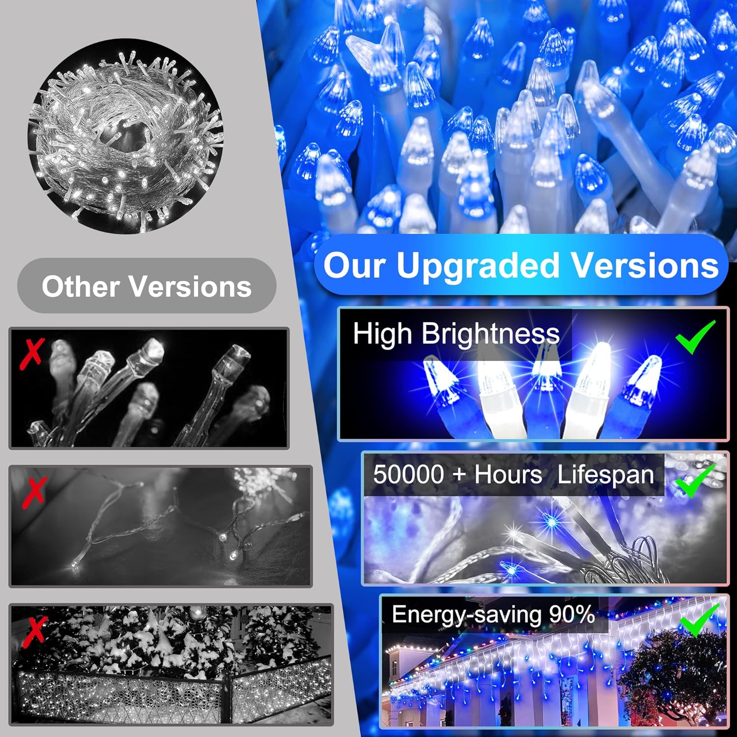 - Twinkle Through Any Winter Weather: Built to handle snow, rain, and icy winds, our outdoor waterproof cool white & blue icicle lights shine strong in any condition. Their frosty glow combines the serenity of blue with the clarity of white, making them perfect for decorating porches, gazebos, or garden arches. Even in the harshest weather, these durable holiday decoration lights keep twinkling, bringing elegance and festive spirit to every corner of your home