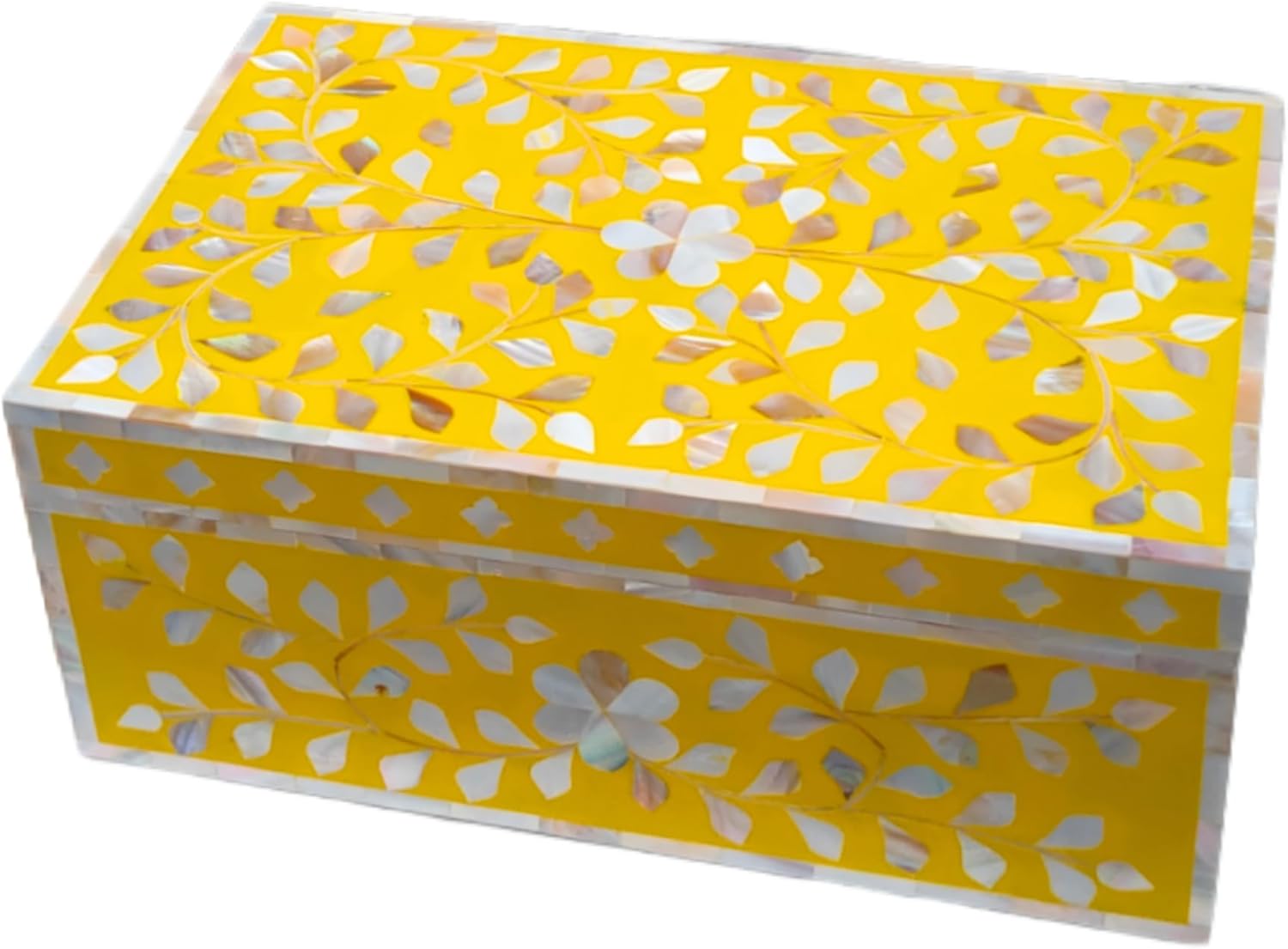 Decorative Storage Box Of Mother Of Pearl Inlay Floral Design Wooden Storage Box For Home Decoration For Living Dining & Bedroom (Yellow_9x6x3.5 inch)