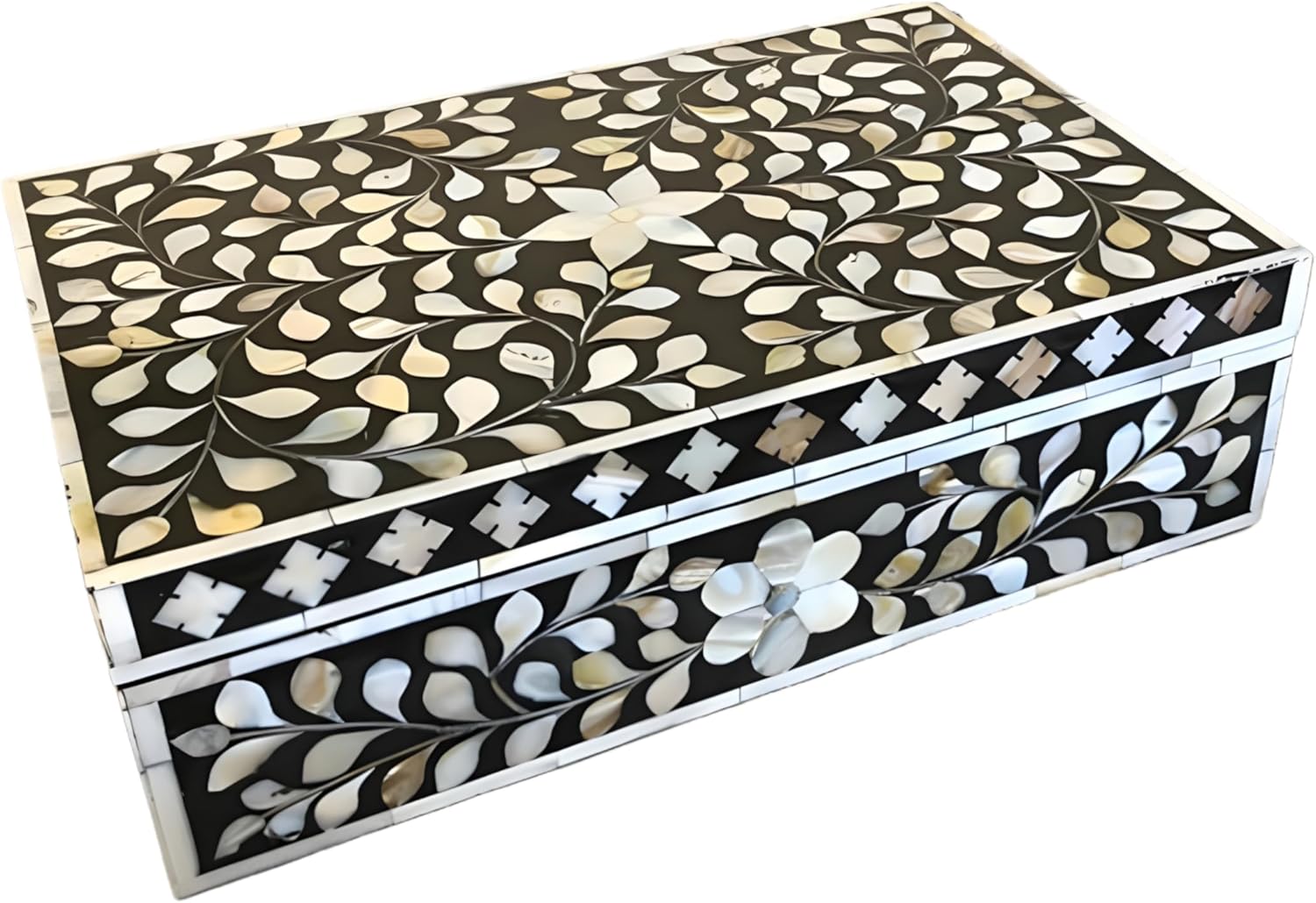 Decorative Wooden Storage Box with Mother of Pearl Inlay – Elegant Floral Design – Perfect for Home Décor in Living Room, Dining Area, or Bedroom (Black, 12x8x5 inches)