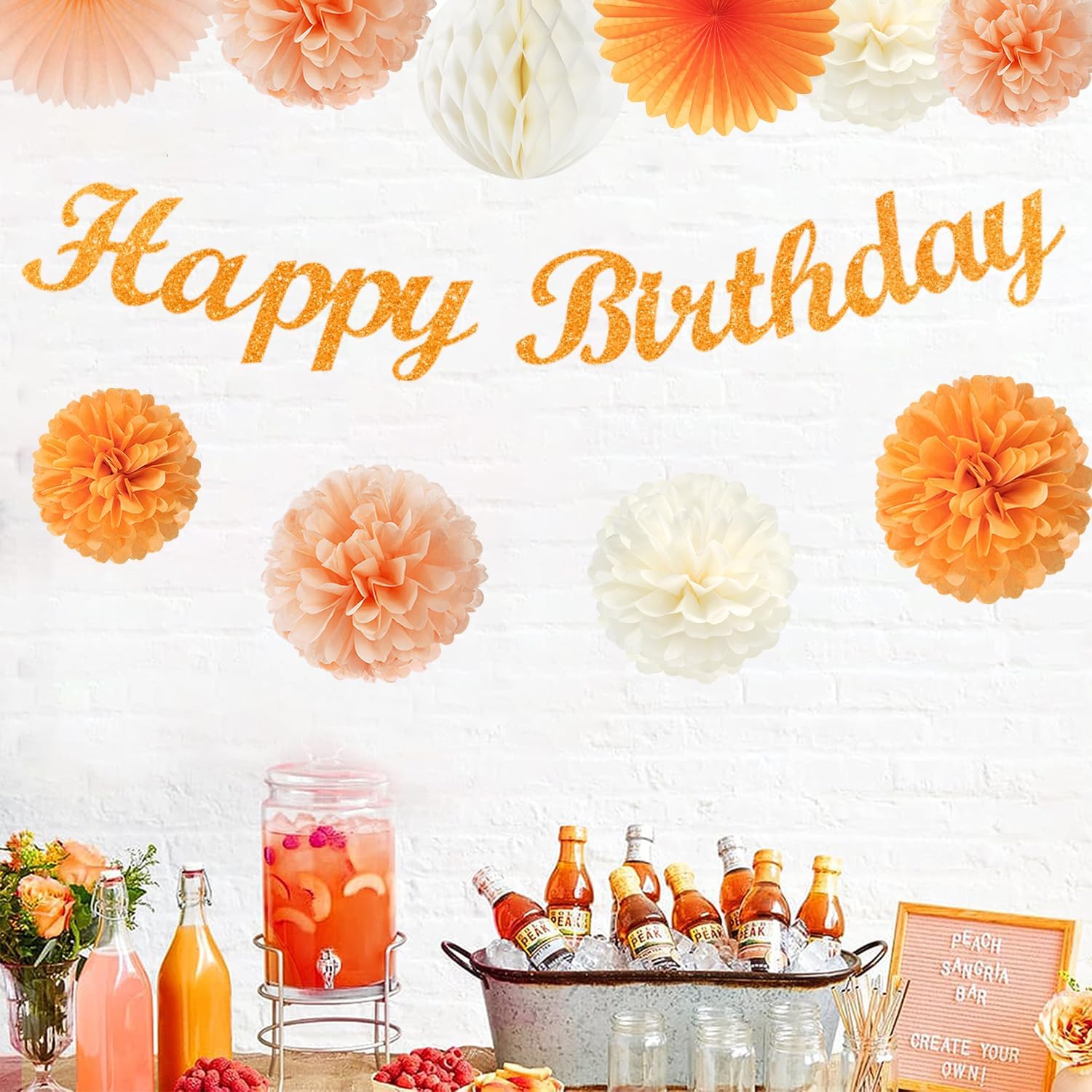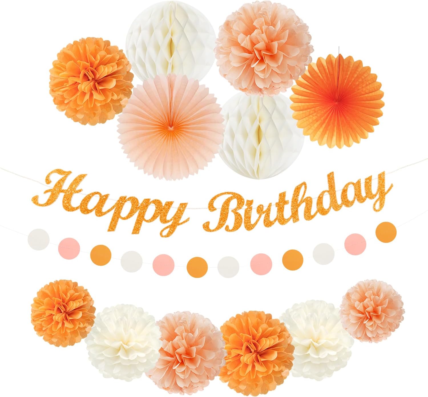 - 【Orange birthday decorations kit includes】The party decorations kits include 8pcs orange white peach paper flower, 2pcs orange paper fans,2pcs 8" white paper honeycomb, happy birthday garland and orange streamers.
