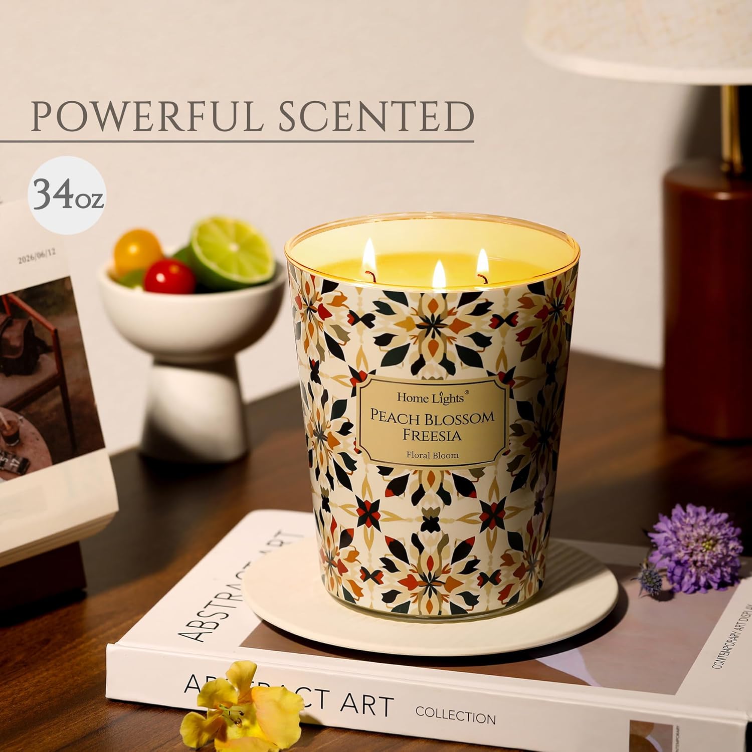 HomeLights 3-Wick Candles for Home Scented - 34oz Soy Wax Blend Candle Long-Lasting Fragrance, Bohemian Natural Textures Home Decor and Housewarming Gifts, Peach Blossom Freesia