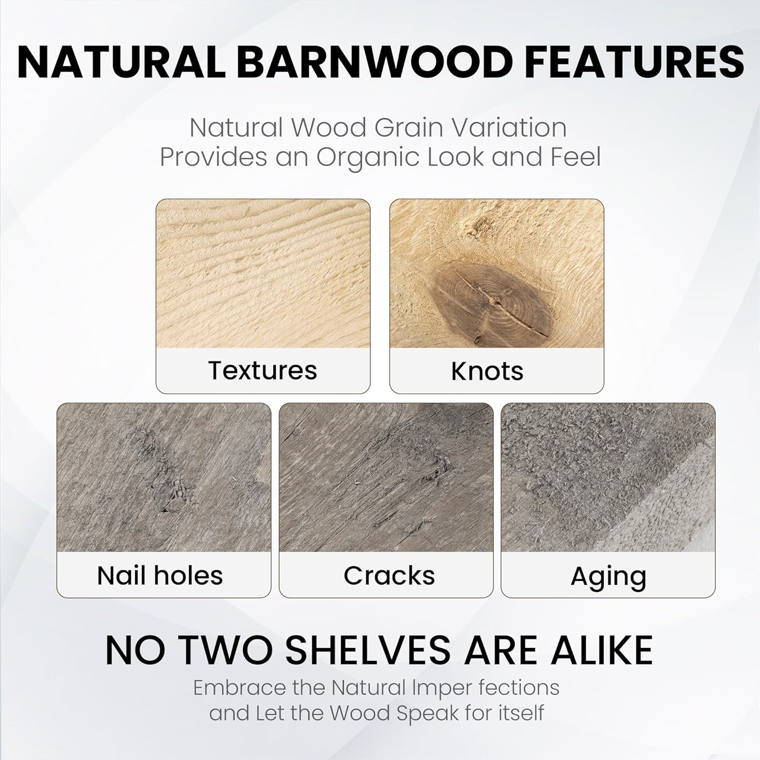- Thick Reclaimed Wood Shelves: Fun Memories floating shelves are handcrafted from 1.4" thick solid reclaimed wood, measuring 40" x 8". Natural barnwood featuresâsuch as nail holes, discoloration, and surface wearâmake each shelf a one-of-a-kind, authentic dĂ©cor accent