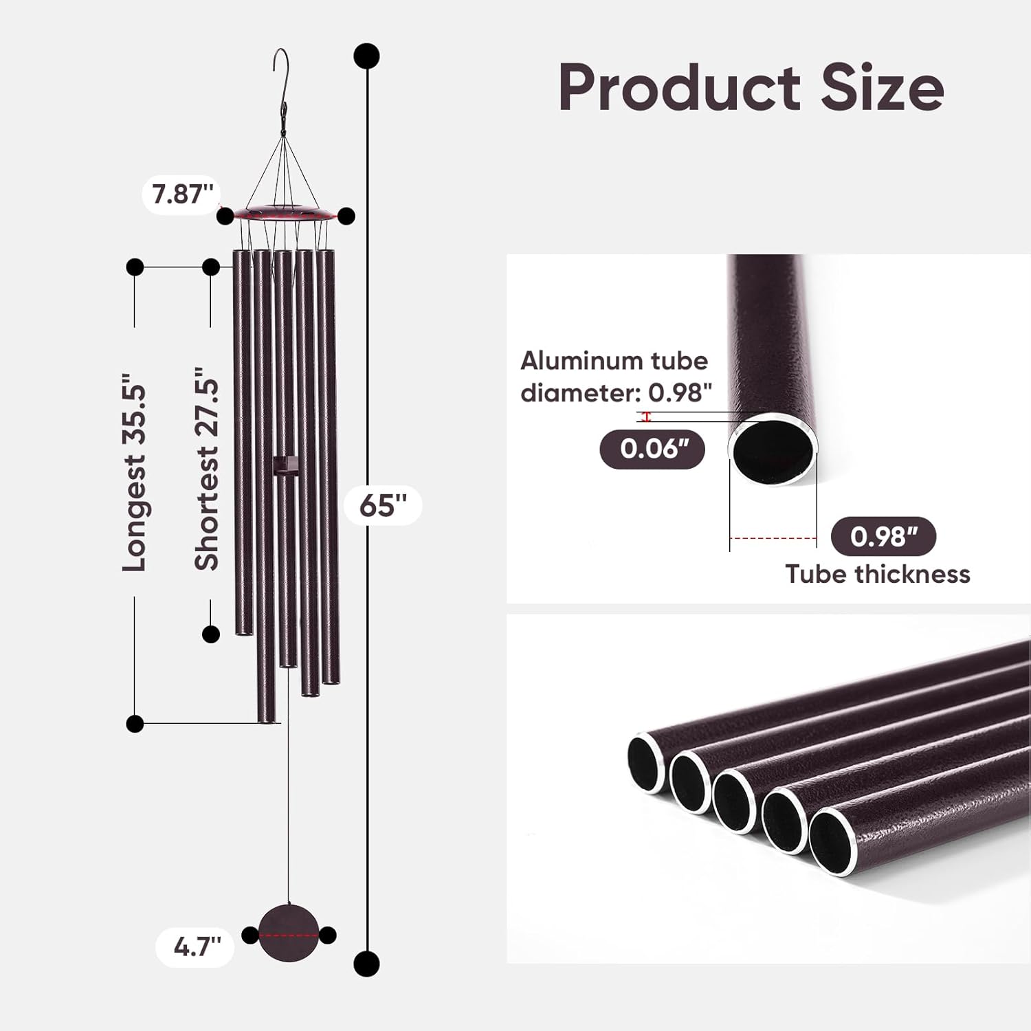 - [ Melodious Deep Tone] Our 65 inches extra large wind chimes, with deep and melodious tones, bring tranquility and harmony to your outdoor space. Our deep tone wind chime features the longest aluminum tube measuring 35.5 inches and the shortest at 27.5 inches, ensuring a deep and enduring sound quality that meets your expectations.