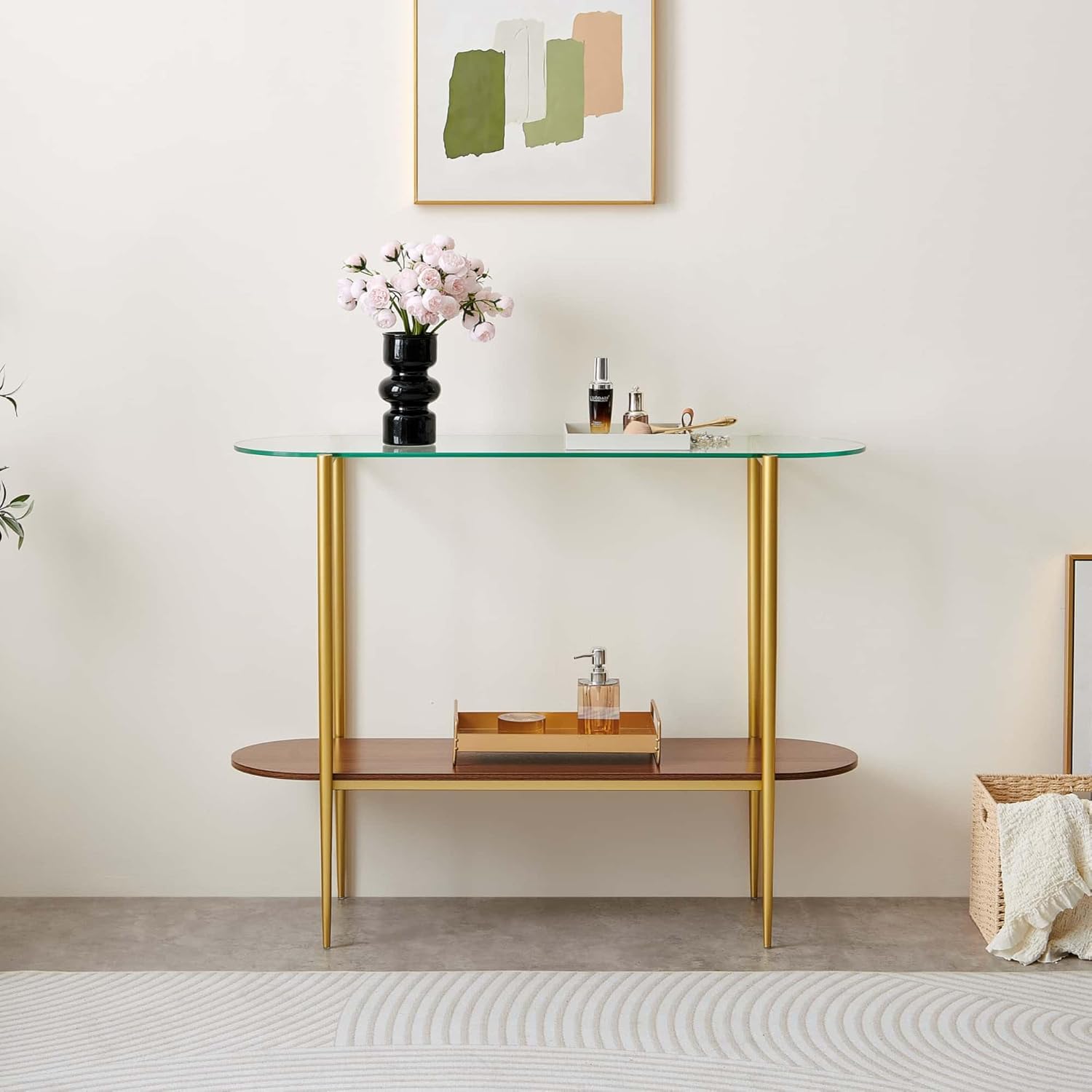 Oval Glass Console Table for Living Room, Foyer & Entrance, 2-Tiers Mid-Century Modern Sofa Table with Clear Glass Top, Walnut Finish Wood Shelf and Gold Finish Frame