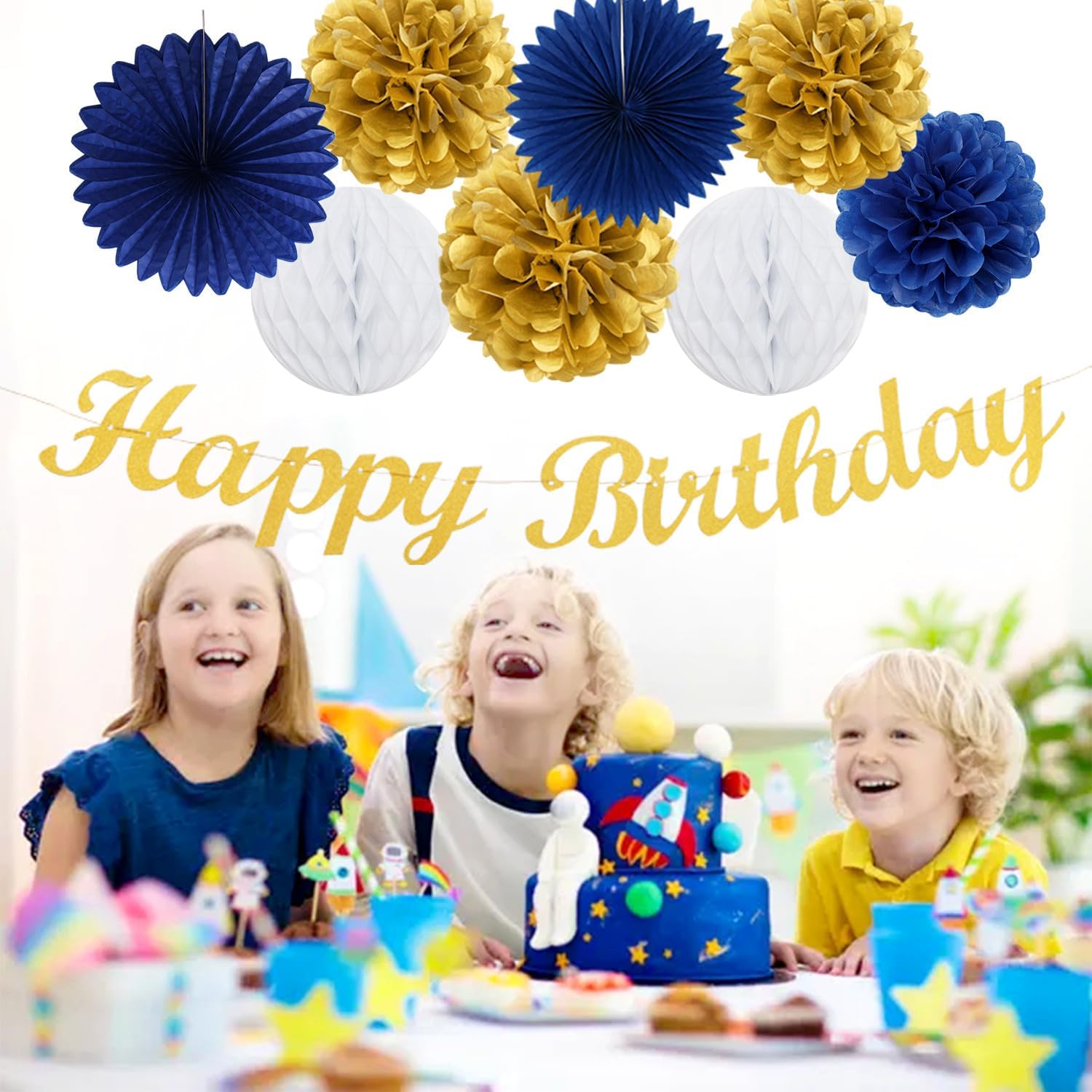 Navy-Blue Gold Birthday Party-Decorations Paper-Flowers - 14pcs Happy Banner Royal Lanterns Tissue Pom Poms,Men Streamers Garland Fans Honeycomb,Teen Boys Male Kids Hanging Supplies Decor Hugfond