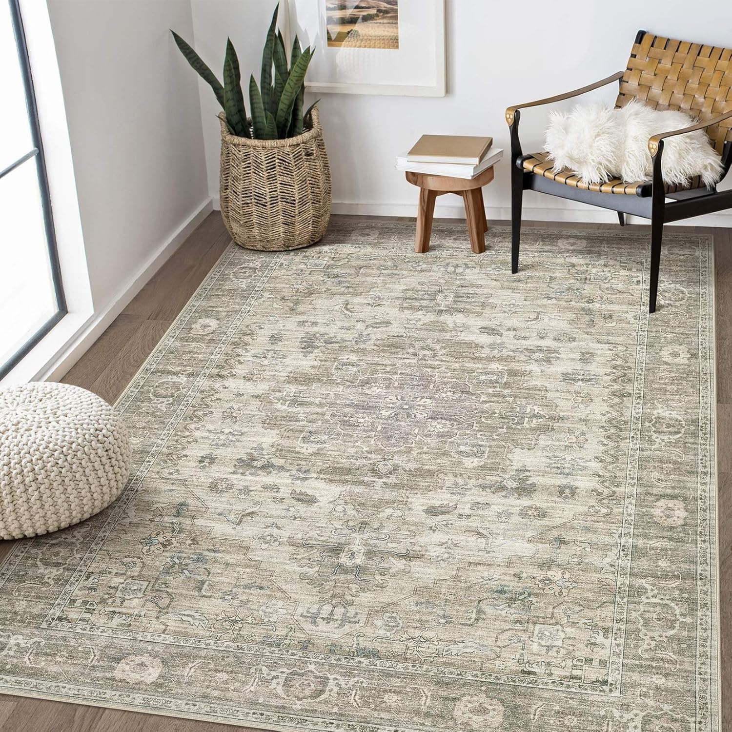 Washable Area Rugs for Living Room - 5x7 Neutral Vintage Distressed Floral Farmhouse Boho Large Soft Floor Rug Indoor Non Slip Carpet for Living Room Bedroom Dining Room Office - Brown/Tan