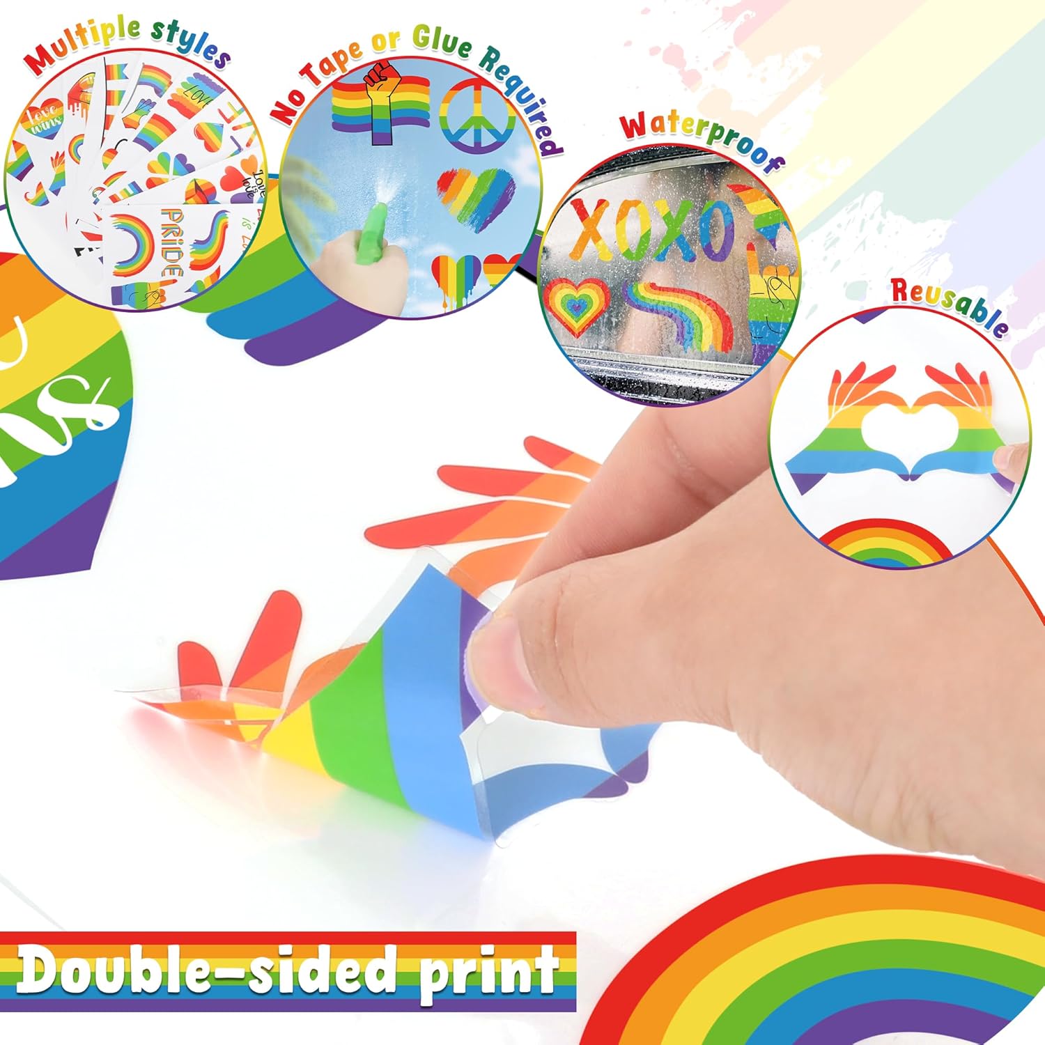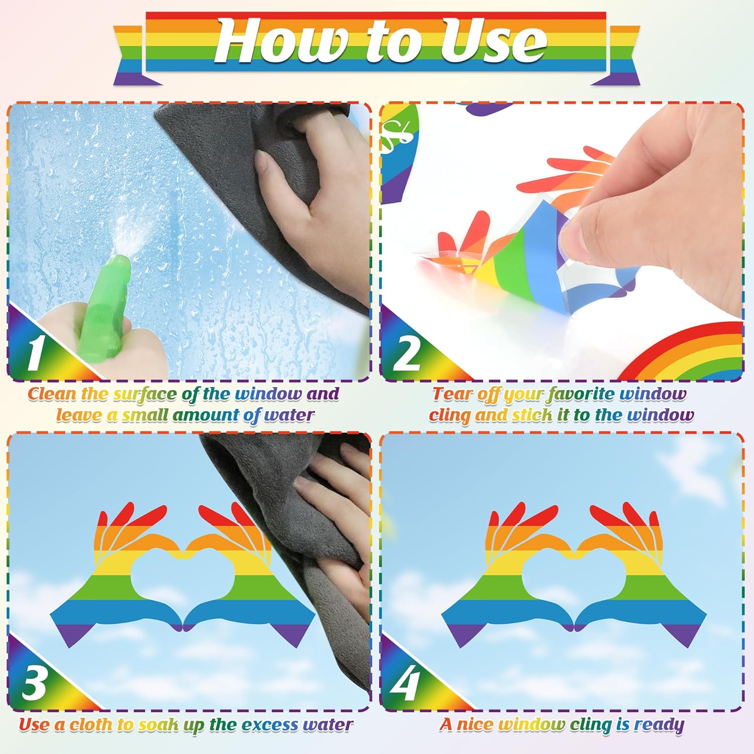 - Effortless Application - Just clean, apply with water and stick! These double-side LGBT window clings require no tape or glue, yet remove cleanly for endless repositioning. Perfect for creating custom rainbow displays that stay vibrant without residue.