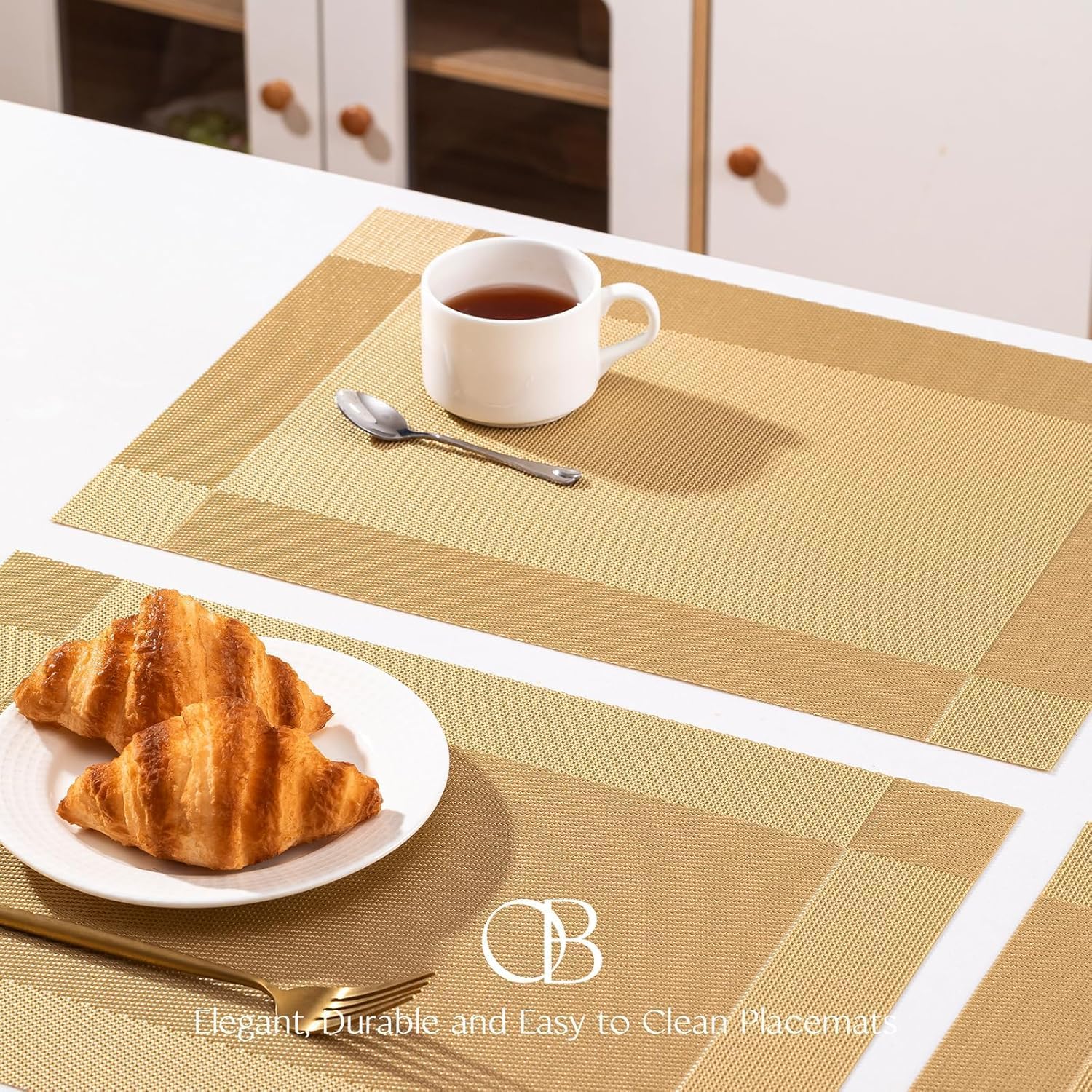 Placemats Set of 8 - Easy Clean Woven Vinyl Placemats for Dining Table, Indoor/Outdoor Place Mats, Washable PVC Table Mats(Gold Cube)