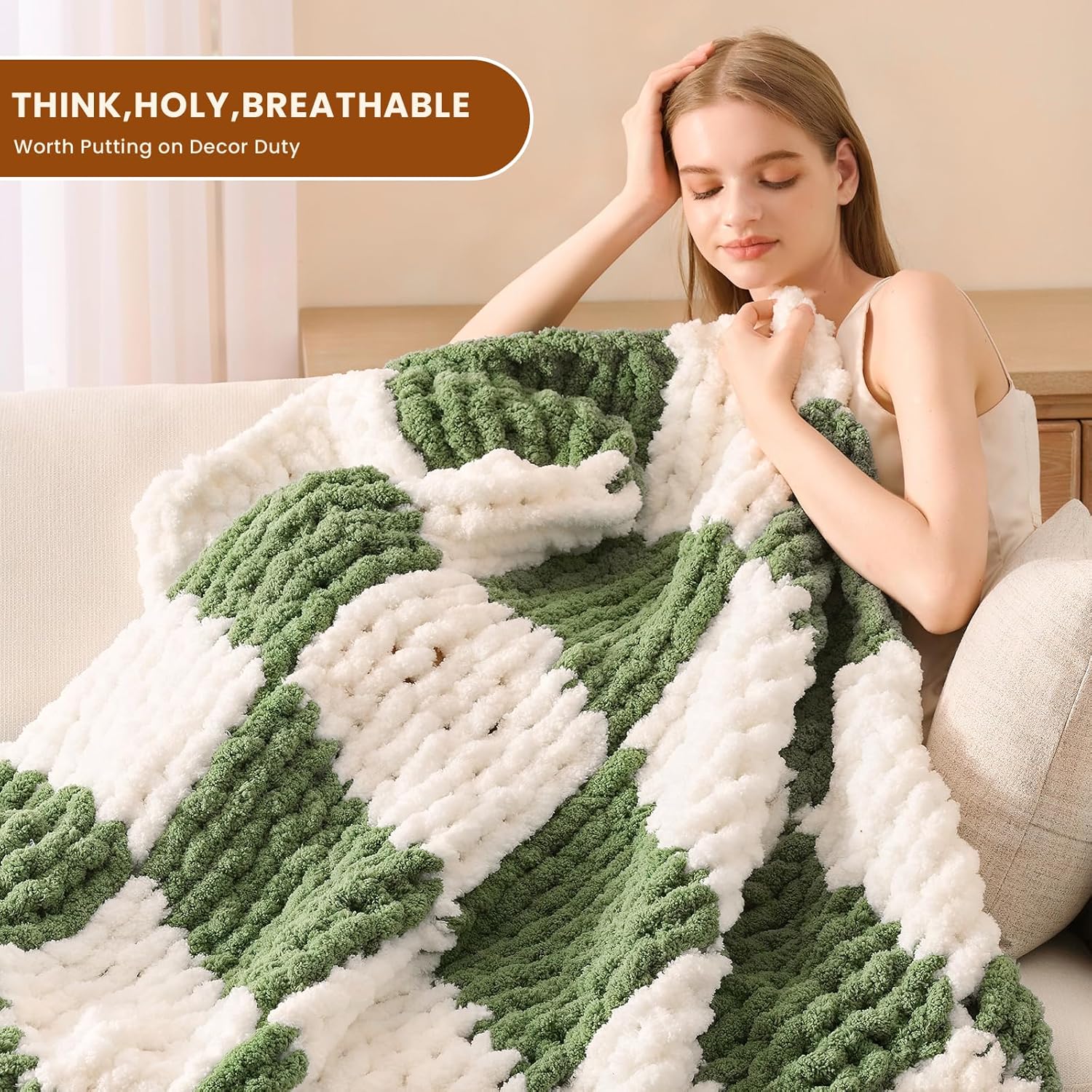 L'AGRATY Chunky Knit Blanket Throw: 50''x60'' Chenille Chunky Knitted Throw Blankets for Bed Couch - Handmade Thick Cable Knit Blanket - Large Crochet Rope Blankets for Home Decor(Green Checkered)