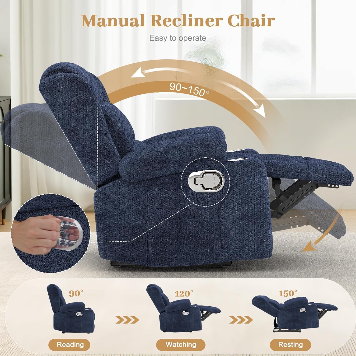 - MANUAL RECLINER: The recliner chair tilt adjuster is a pull tab manual design, when you are using it, you only need to gently pull the pull ring on the right side of the recliner, the recliner's foot pedal will pop out, use the backrest force to lean back and adjust the recliner to your comfortable position. The simple design allows you to recline from 90° to 150°. When not in use, simply press the foot pedal with your heel and the recliner chair will return to its original position. Compared with electric recliners, the failure rate is lower and the use is more assured.