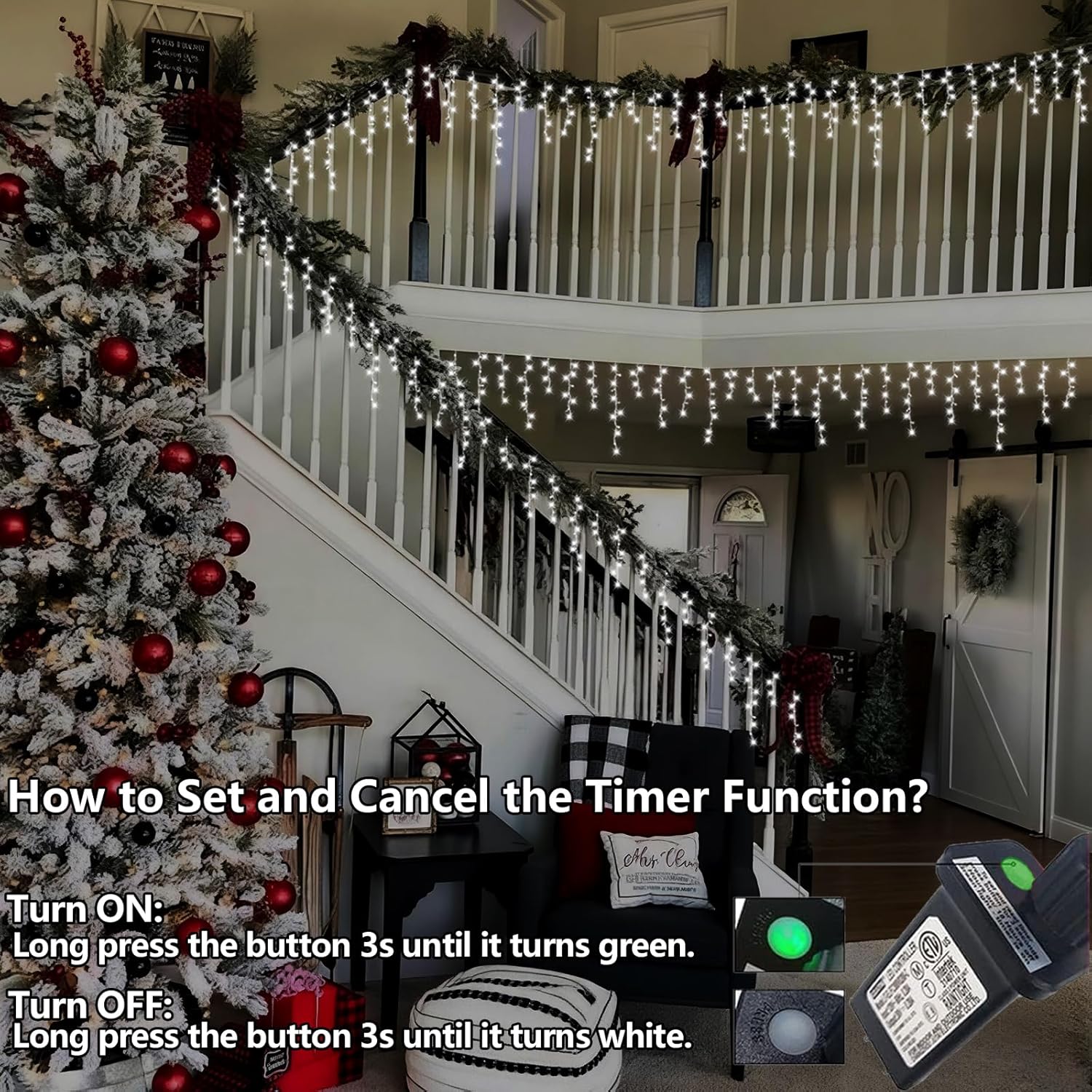 - 8 Impressive Modes Christmas Icicle Lights: Christmas icicle lights has 8 different settings(① fireflies flashing ② waves fading ③ chasing ④ flashing ⑤ fading slowly ⑥ twinkle ⑦ flashing ⑧ steady on) through the button on the back of the transformer. Different Modes add a playful touch to any occasion, like Christmas, Wedding, Birthday, Anniversary and more, enjoy beautiful and cheerful ambience and enrich your holiday atmosphere.