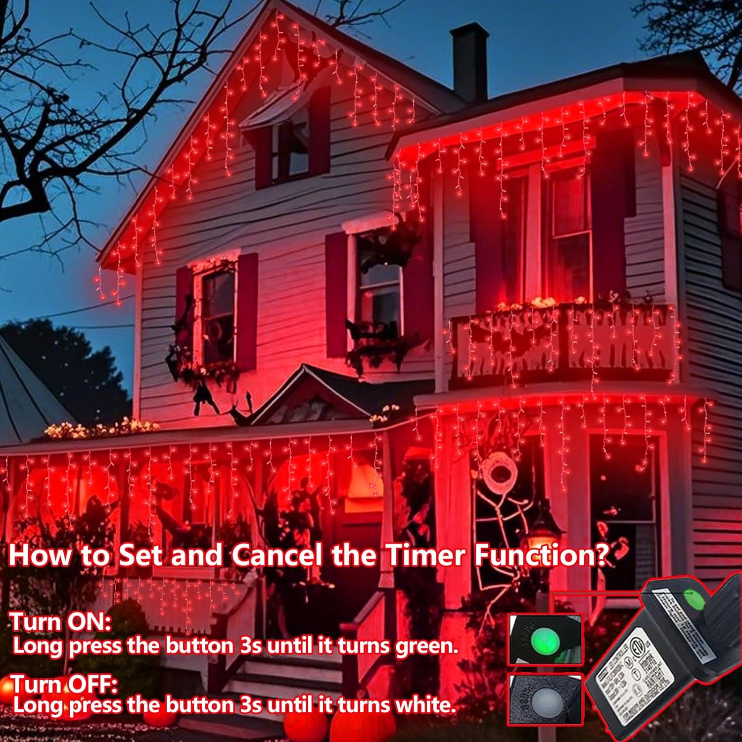 - Connectable Red Icicle Lights: The 33ft 400 LED red icicle lights has 80 drop with four different lengths which are enough to display pretty for your halloween decor. When you decorate with our icicle lights, each icicle lights has end-to-end connection, bright a terrifying night. Icicle lights are connectable, it can cover a larger area.