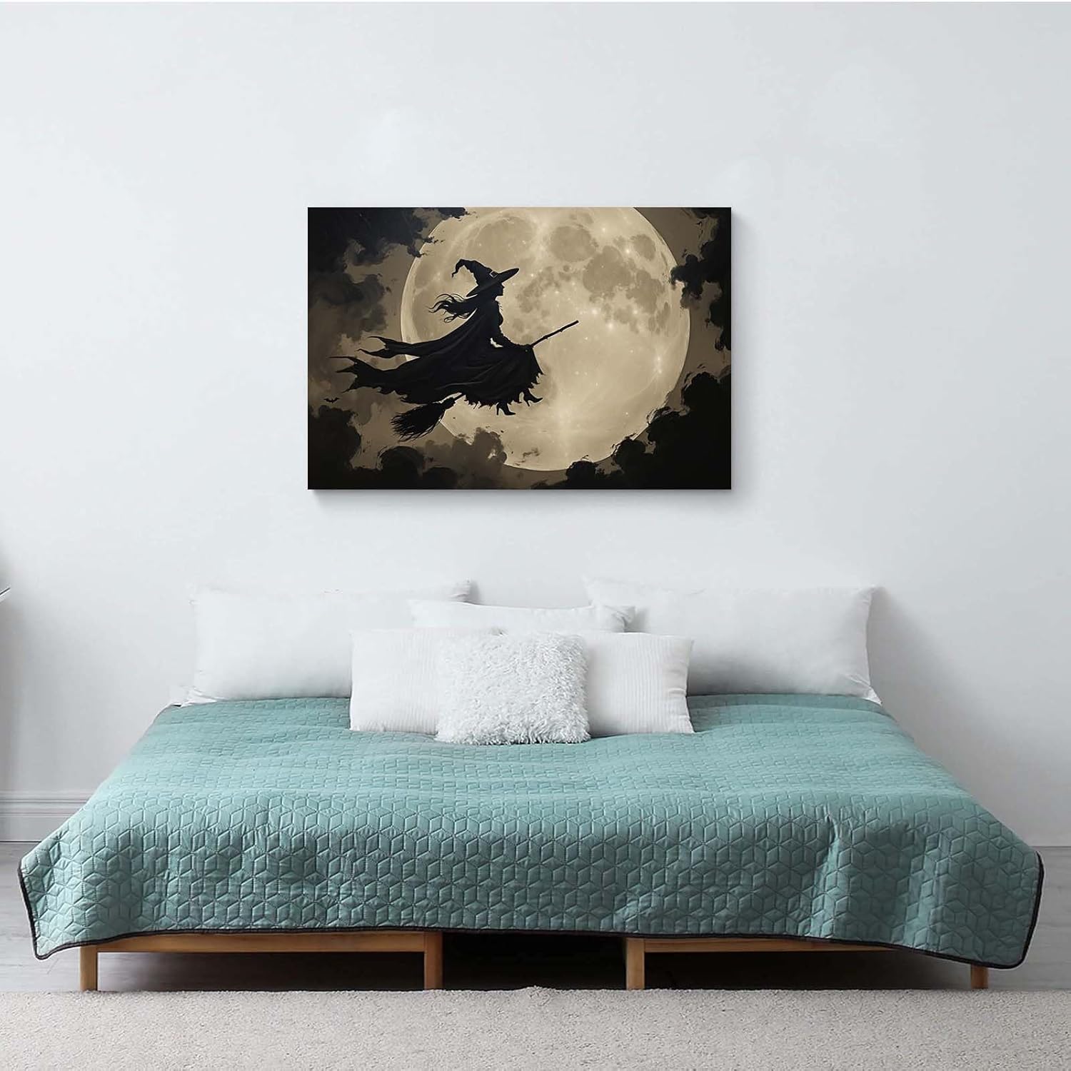 Full moon witch silhouette poster witch on magic broom Halloween mural poster decorative mural art suitable for home living room bedroom16x24in Wood Framed