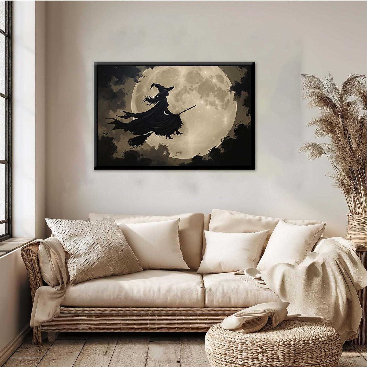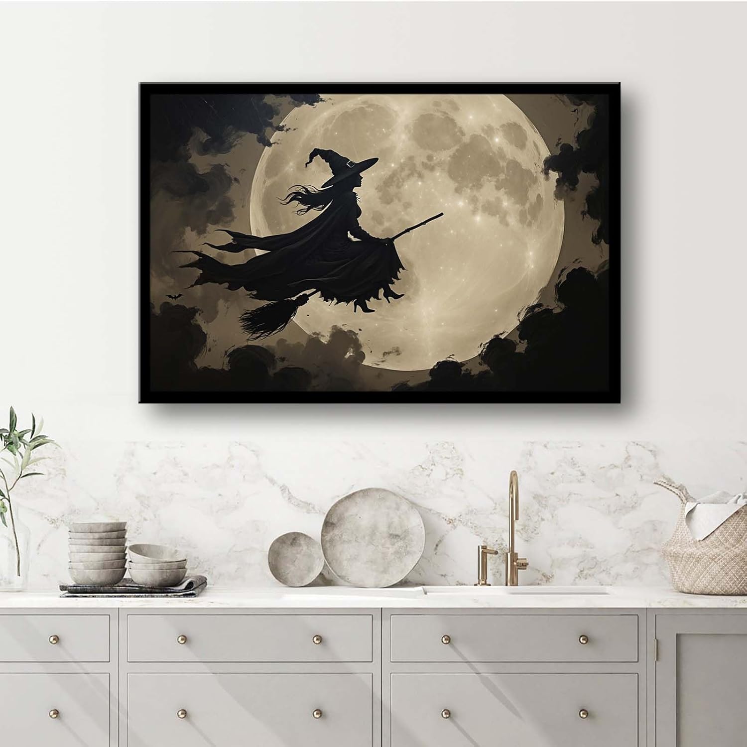 JFHCQJPK Full moon witch silhouette poster witch on magic broom Halloween mural poster decorative mural art suitable for home living room bedroom16x24in Metal blackFramed