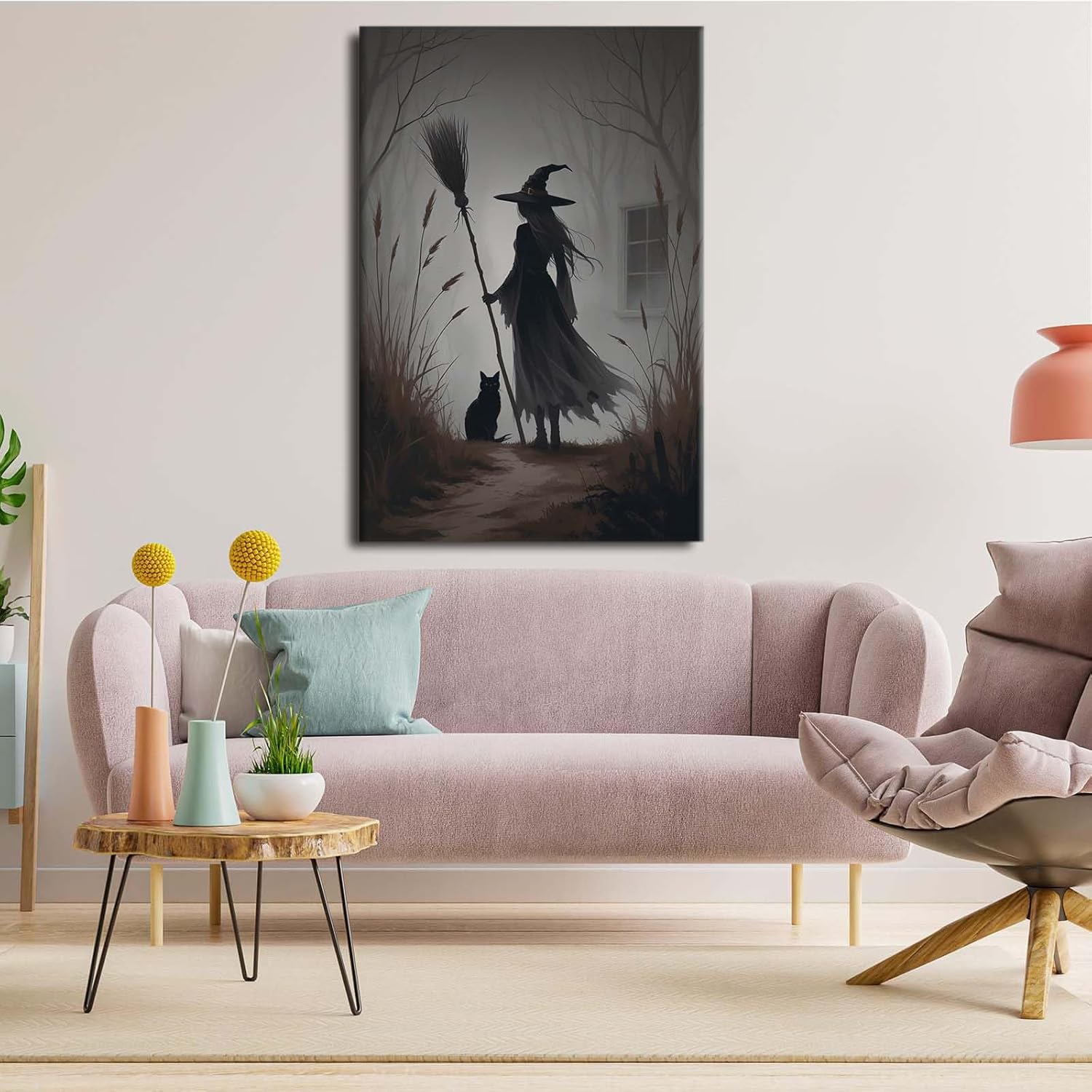 Vintage forest witch and black cat poster Halloween mural poster decoration mural art magic suitable for home living room bedroom12x16in Wood Framed
