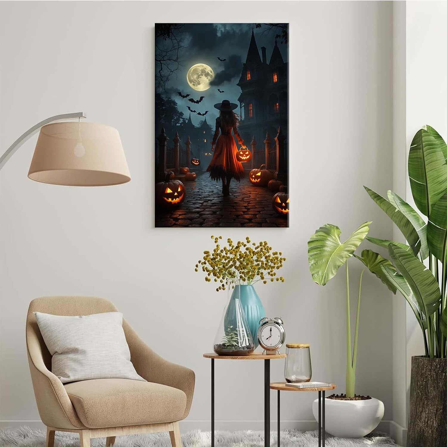 Halloween theme poster moonlit autumn night witch vintage poster art print dark college style gothic painting canvas wall decoration bedroom living room ideal gift24x36in Wood Framed