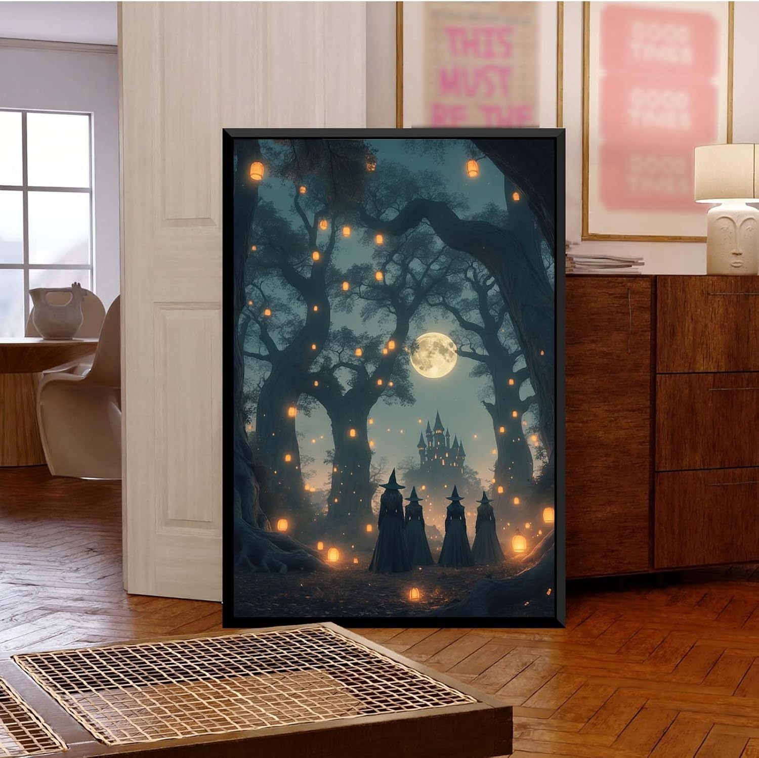 JFHCQJPK Mysterious creek painting witch and castle in magic forest art print canvas gothic print dark college decoration poster for home bedroom20x30in Metal blackFramed