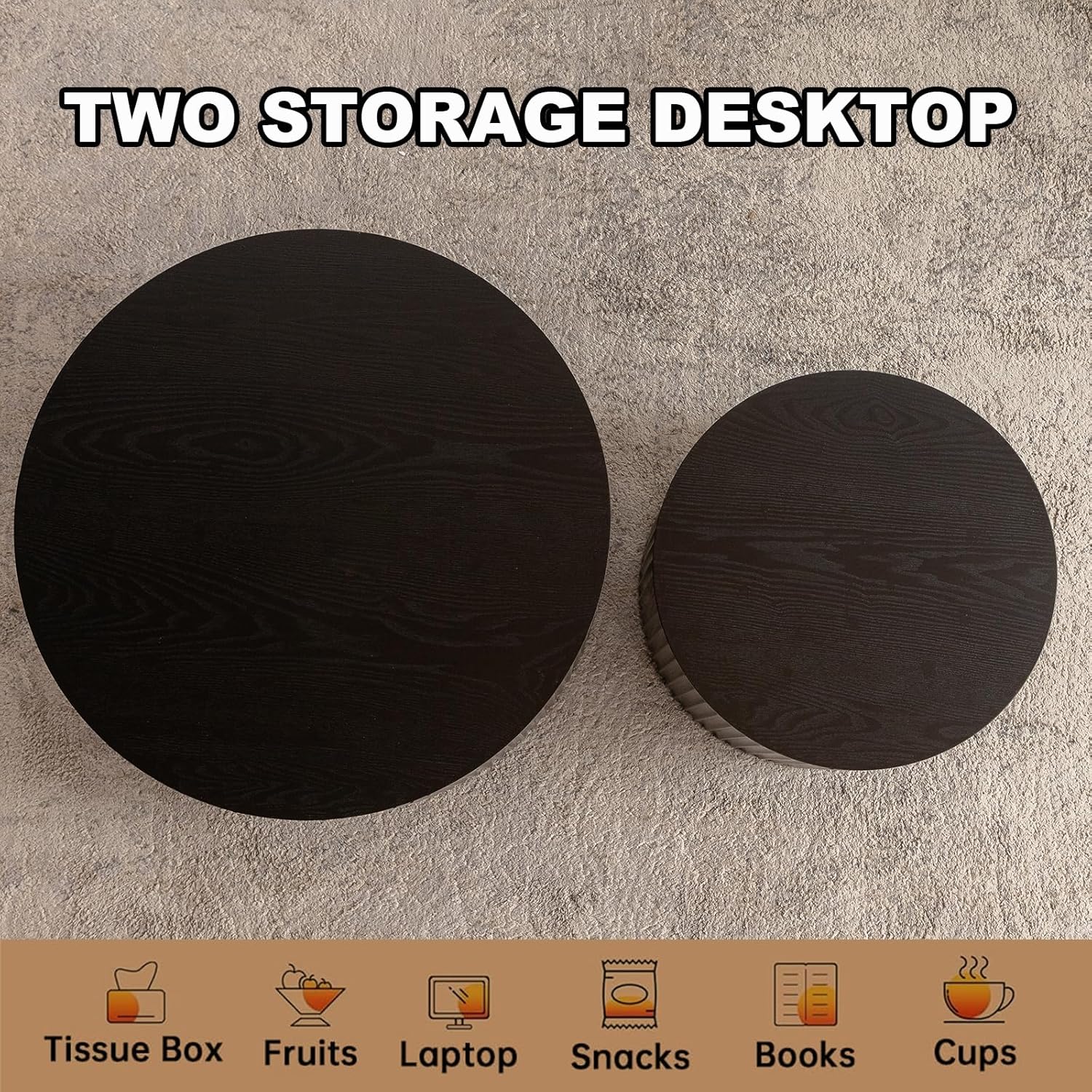 Nesting Coffee Table Set of 2 Modern Black Handcraft Fluted Coffee and End Table Sets Wooden Drum Small Round Side Table Funky Center Tables for Living Room,No Assembly,Black Large